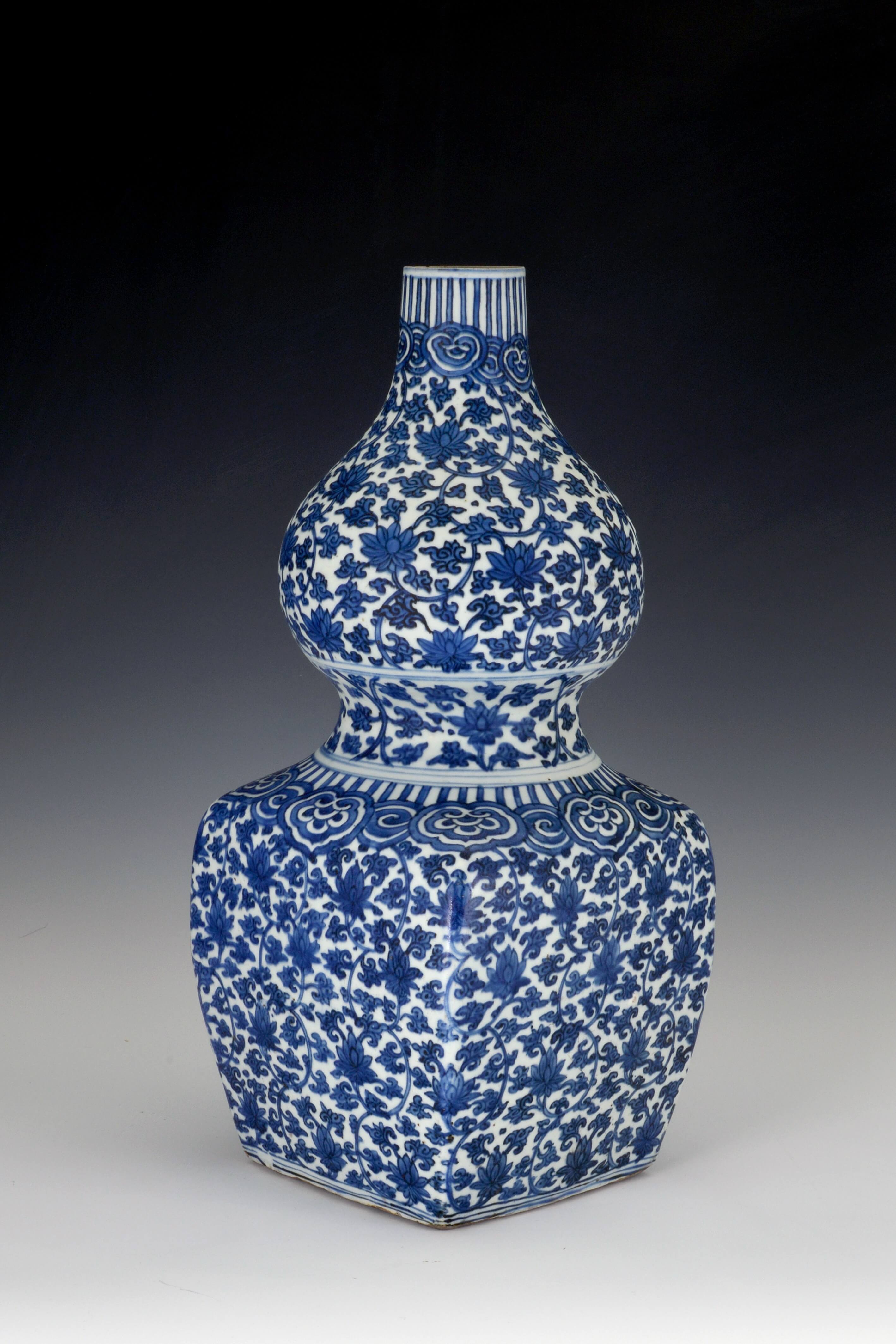 | Erweiterte Beschreibung | Hohe, schlanke Kalebasseform mit einem rechteckigen unteren Teil; der ursprünglich höhere Hals ist abgeschliffen. Der Dekor ist in Unterglasurblau gemalt: Auf den verschiedenen Gefäßteilen dicht verzweigte Lotosblütenranken; auf der Schulter des unteren Gefäßkörpers ein Muster aus Stäben und Ruyi-Köpfen, das sich am Halsansatz wiederholt. Eingetiefte, unglasierte Basis. Zu dieser Vase gab es in der Sammlung ein Gegenstück. Das Objekt ist im Katalog durch Ohlmers Sammlung unter der Nr. 175 (1932) und Nr. 40 (1898 Blauweiß) zu finden. |