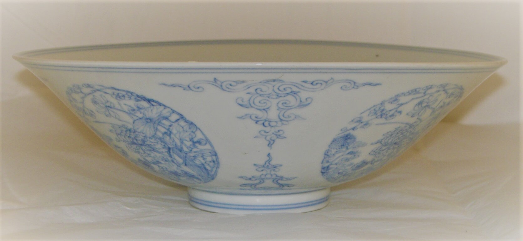 | Erweiterte Beschreibung | Mit leicht gerundeten, schräg nach außen stehenden Seiten. Der Dekor ist in einem blassen Unterglasurblau gemalt: Auf der Außenwandung, viermal wiederholt, Medaillons mit den Blumen der vier Jahreszeiten, Pflaume, Päonie, Lotos und Chrysantheme, und dazwischen Arabeskenranken; im Inneren auf dem Grund ein Medaillon mit einem Schmetterlingspaar, eingefaßt von einem Doppelring, der sich unterhalb der Lippe, innen und außen, sowie am Fußring wiederholt. Die Sechs-Zeichen-Marke innerhalb eines Doppelrings ist in Unterglasurblau auf die Basis geschrieben. Der Dekor dieser Schale sollte möglicherweise ursprünglich mit Emailfarben über der Glasur in Doucai-Technik ergänzt werden, für die der unterglasurblaue Dekor die Konturlinien gebildet hätte. Wegen des kleinen Brandrisses auf der Basis und der leichten Verformung der Schale wurde dies wahrscheinlich dann unterlassen. Zu der Hildesheimer Schale gibt es in Doucai-Technik identische Beispiele in der William Rockhill Nelson Gallery of Art ( Sekai toji zenshu, XII, Tafel 64), im Gulbenkian Museum ( Legeza, Malcom Macdonald Collection, Kat. Nr. 378) und im Victoria and Albert Museum. Das Objekt ist im Katalog durch Ohlmers Sammlung unter der Nr. 256 (1932) und Nr. 67 (1898 Bunt) zu finden. |