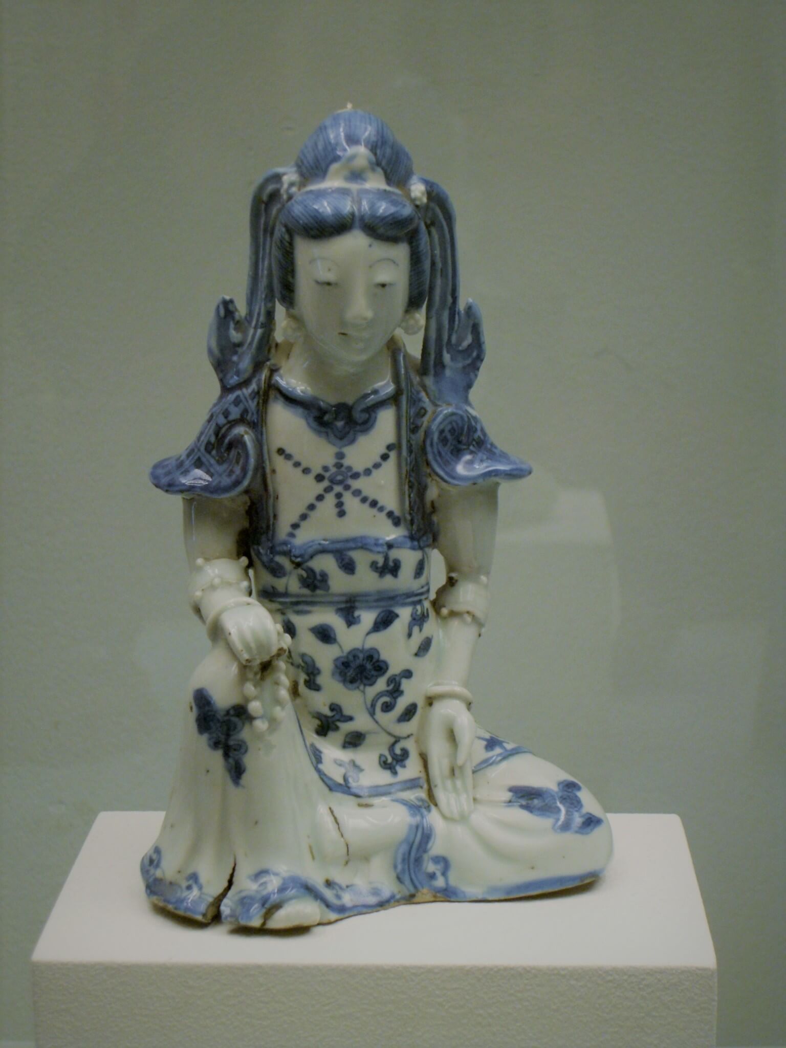 | Erweiterte Beschreibung | Ming-Dynastie (1368-1644); Diese sitzende Figur der Kuan Yin (Göttin der Barmherzigkeit und der beschützenden Liebe) hat ihren linken Fuß auf dem Boden, ihr rechter ist eingezogen. Ihre linke Handfläche ist nach oben gewandt und weist auf die Wade. Ihre rechte Hand ruht auf dem Knie. Darin hält sie eine Kette mit Perlen. Ihr Gewand ist mit Blütenranken und gemaltem Perlbehang verziert. Im Rücken findet man ein rechteckiges Loch. Die Unterglasur ist in Kobaltblau bemalt. Guanyin: Göttin der Barmherzigkeit, weibliche Form des Avalokitesvara; im Daoismus ist sie einer der Unsterblichen (keine Verbindung zum Avalokitesvara). Das Objekt ist im Katalog durch Ohlmers Sammlung unter der Nr. 165 (1932) und Nr. 70 (1898 Blauweiß) zu finden. |