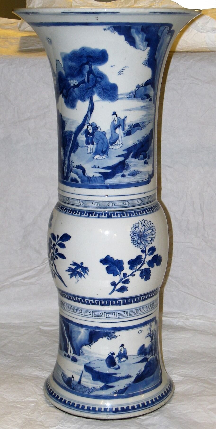 | Erweiterte Beschreibung | Qing-Dynastie (1644-1911), Kangxi-Periode (1662-1722), Artemisiablatt-Marke. Mit schlankem Gefäßkörper im Typus der archaischen Kultbronze Gu, gegliedert durch eine leicht gebauchte Mitte, Mündung und Fuß ausschwingend. Der Dekor ist reich laviert in Unterglasurblau gemalt: Oben und unten je zwei gerahmte Paneele mit Gebirgslandschaften mit Gelehrten, Bauern und Fischern und in der Mitte als umlaufendes Band vier Blütenzweige mit ornamentaler Rahmung oben und unten. Auf die Basis ist als Marke ein Doppelring mit einem Artemisiablatt in Unterglasurblau gemalt. Das Objekt ist im Katalog durch Ohlmers Sammlung unter der Nr. 186 (1932) und Nr. 29 (1898 Blauweiß) zu finden. |