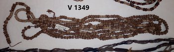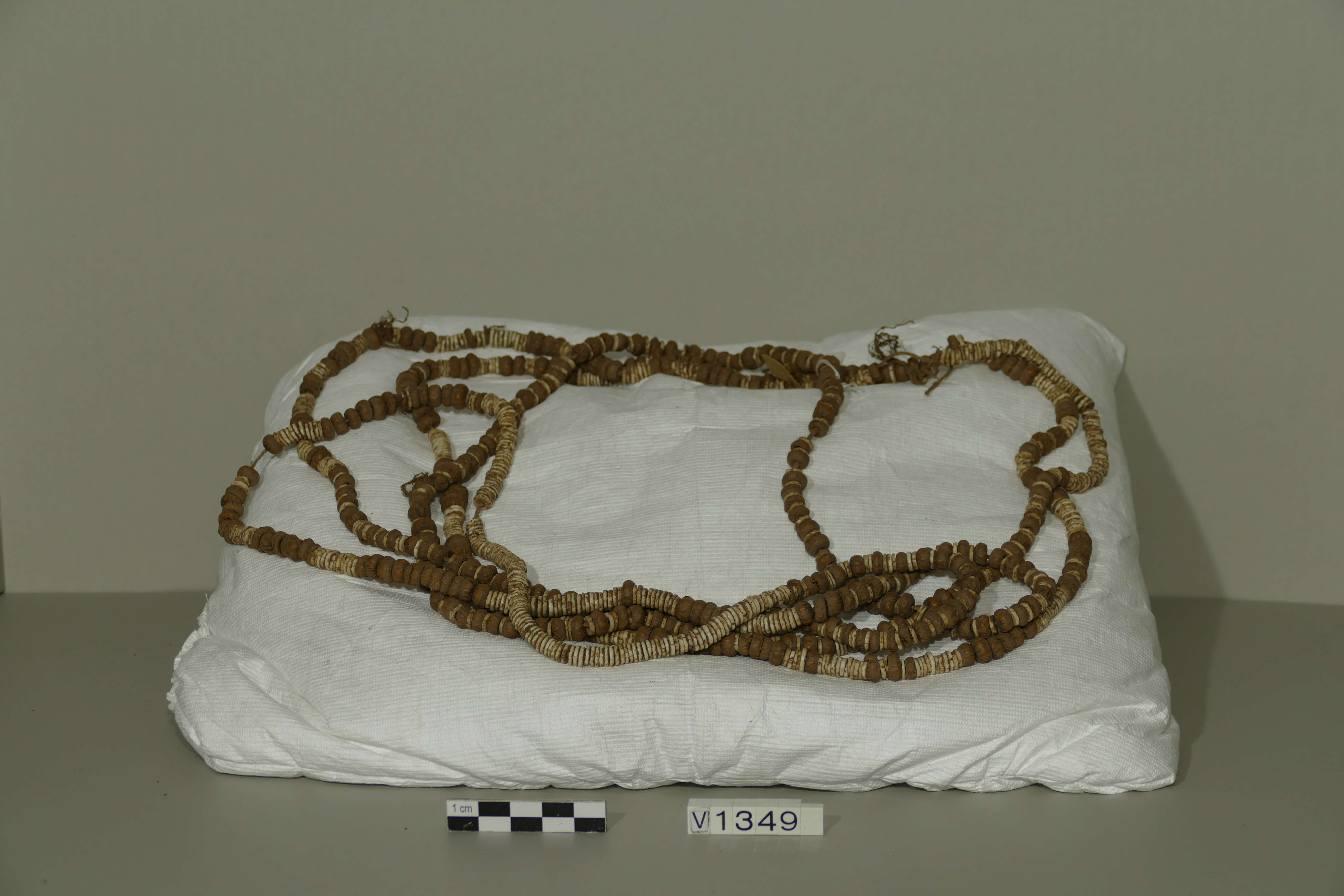 | Inventarbuch-Eintrag | Sehr lange Schmuckkette, besteht aus kleinen aufgereihten Straußeneiplättchen u. Samen. |