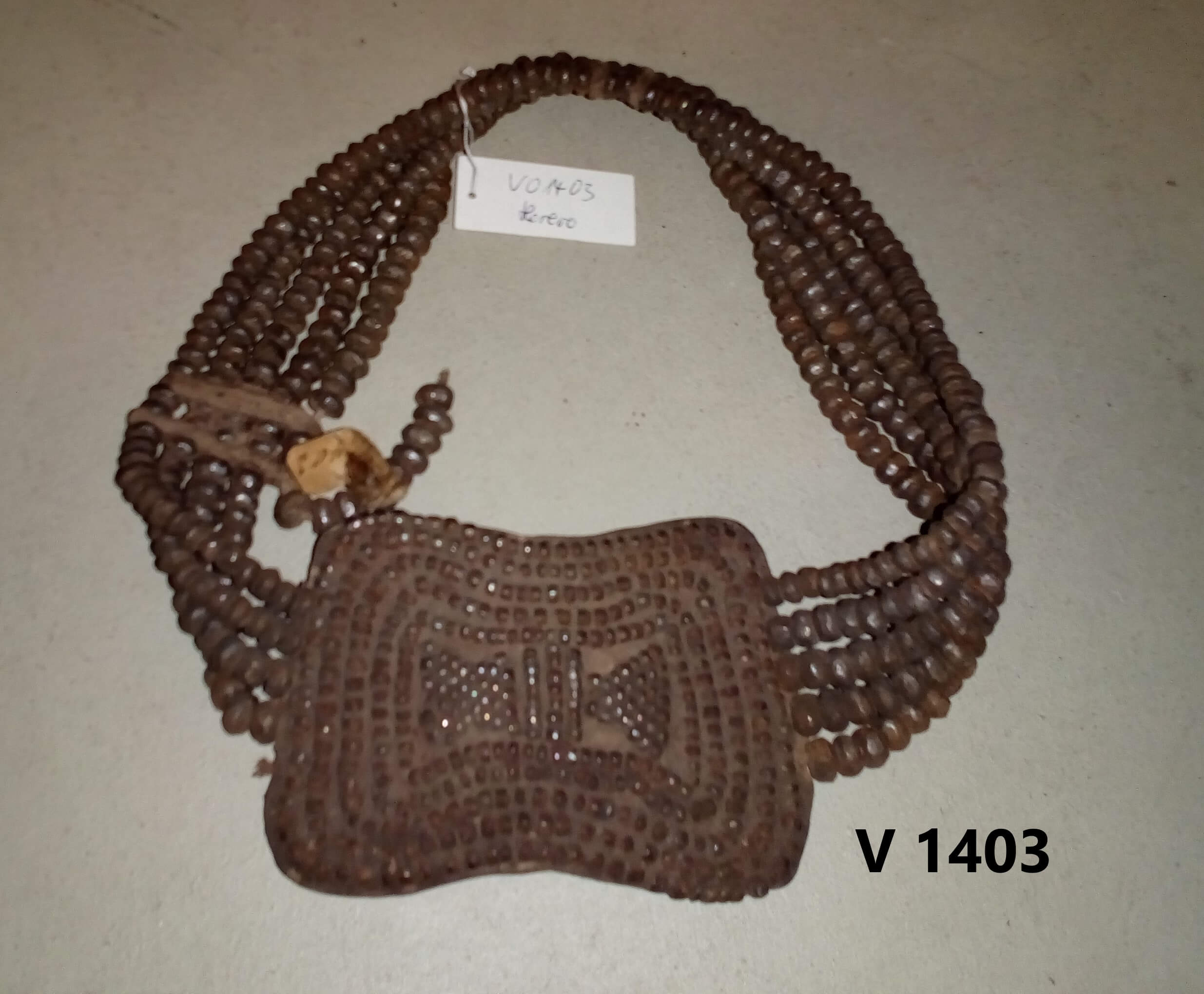 Dieses Objekt sowie mindestens ein ekori, die Bein-Spiralen V 1.405 ff. und möglicherweise auch noch weitere Kleidungs-/Schmuckstücke von Hererofrauen könnten ein Geschenk des Postinspektors (später: Postdirektor) Wilhelm Diers aus dem Jahre 1902 sein. Diers war um die Wende 19./20. Jahrhundert Postbeamter im damaligen Deutsch-Südwestafrika (stationiert in Windhuk). Siehe Bibl. Roemer-Museum Signatur U 53/75, Zeitungsausschnitte betreffend das Roemer- Museum, Nr. 156, 27.09.1902, Postinspektor Diers schenkt "ganze Anzahl von Kleidungsstücken der Herero-Frauen aus Deutsch-Südwestafrika", darunter "den merkwürdigen helmartigen Kopfputz aus Leder und Eisen, ferner Hals- und Beinketten aus Eisenperlen und Leder", letztere ca. 4,5 Kilo schwer. Da die Objekte im Inventarbuch Diers jedoch nicht namentlich zugeordnet sind, wurde unter Vorbesitzer, Zugangsjahr usw. hier jedoch "unbekannt" eingetragen. Außerdem erhielt das Roemer-Museum 1900 durch Kauf Kleidungsstücke der Herero-Frauen durch Vermittlung von Adam Koch (Konservator am Senckenber-Museum Frankfurt), gesammelt von einem nicht namentlich genannten ehemaligen Angehörigen der "Schutztruppe" im damaligen Deutsch-Südwestafrika. Auch diese Gegenstände sind im Inv.-Buch aber nicht gekennzeichnet. Falls das Objekt von Wilhelm Diers stammt, ist es ein Geschenk aus dem Jahr 1902 und er ist der Vorbesitzer.