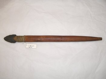 | Inventarbuch-Eintrag | Spitze für einen Weißwalspeer („Kalloziak“) aus Feuerstein, in Holzfassung. 33½ cm lang. |
