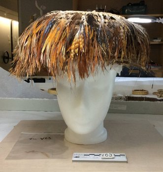 1879 musste J. C. Godeffroy Insolvenz anmelden und nahezu sämtliche Objekte aus dem Museum wurden bis 1886 veräußert. Den Rest erwarb der letzte Kustos des Museums, C. A. Pöhl, um damit eine eigene Naturalien- und Ethnografikahandlung zu eröffnen. Zusammen mit diesem Kopfschmuck verkaufte er dem Roemer-Museum im Mai 1885 die Figur V 64, den Kopfschmuck V 183 sowie die Speerspitze V 61. In Schmeltz/Krause 1881, S. 236-237, erscheinen diese Kopfschmucke nicht bei den Beständen des Museum Godeffroy. In seinem Brief vom 26.05.1885 bietet C.A. Pöhl Hermann Roemer jedoch 3 Kopfputze aus Federn an (Stadtarchiv Hildesheim Best. 741, Nr. 460, "Erwerbungen für die Südsee- und Australien-Sammlungen, 1880-1898").