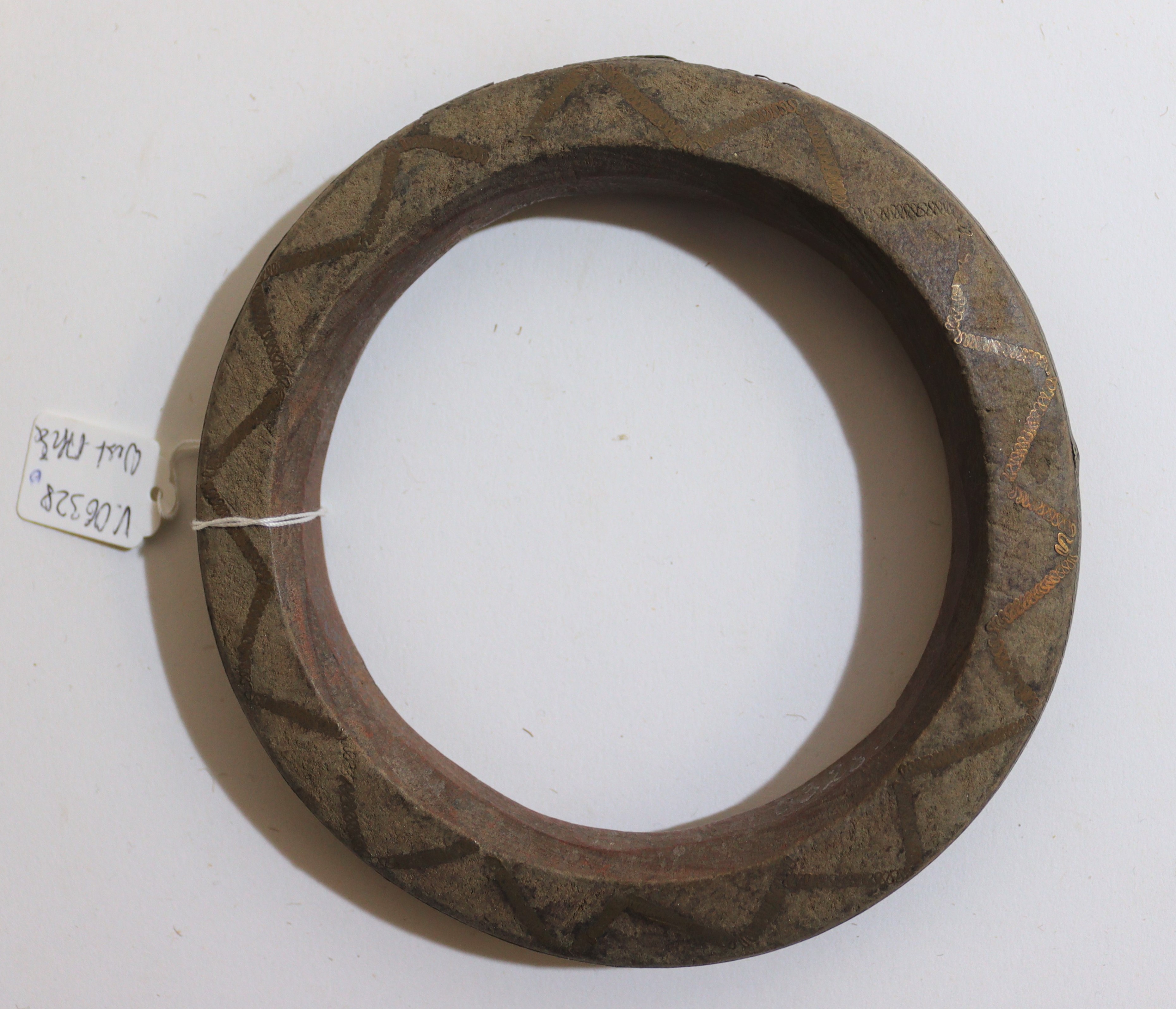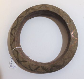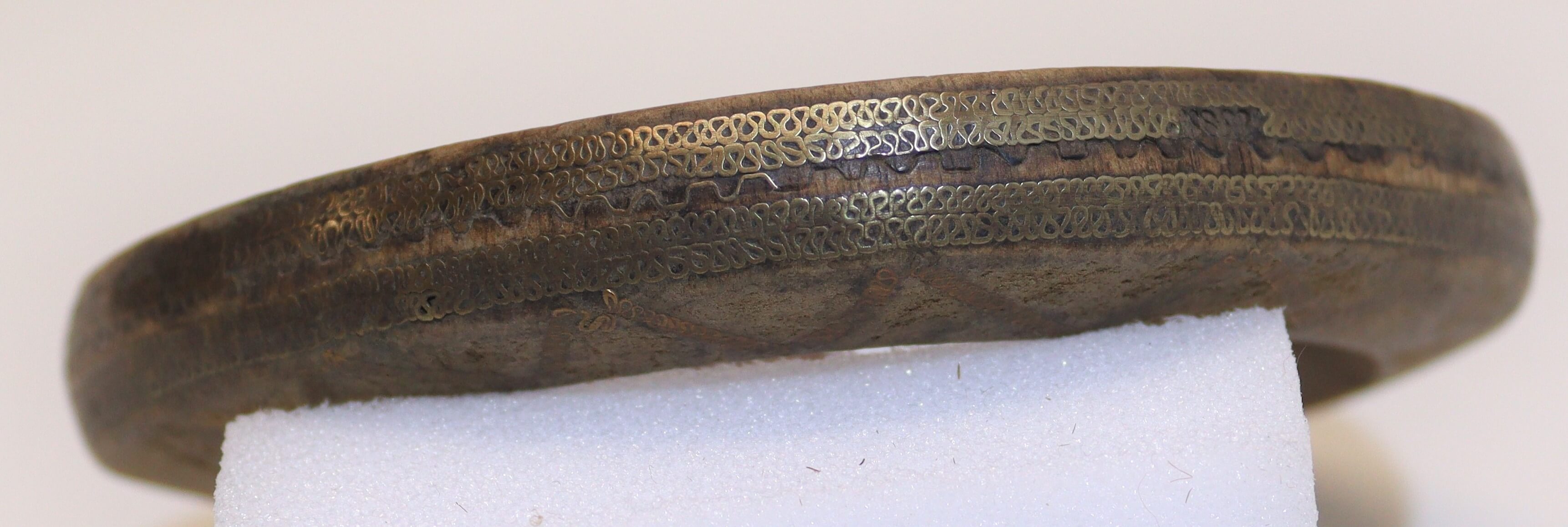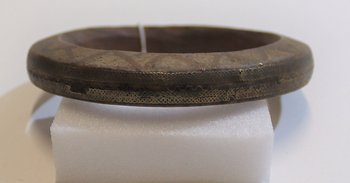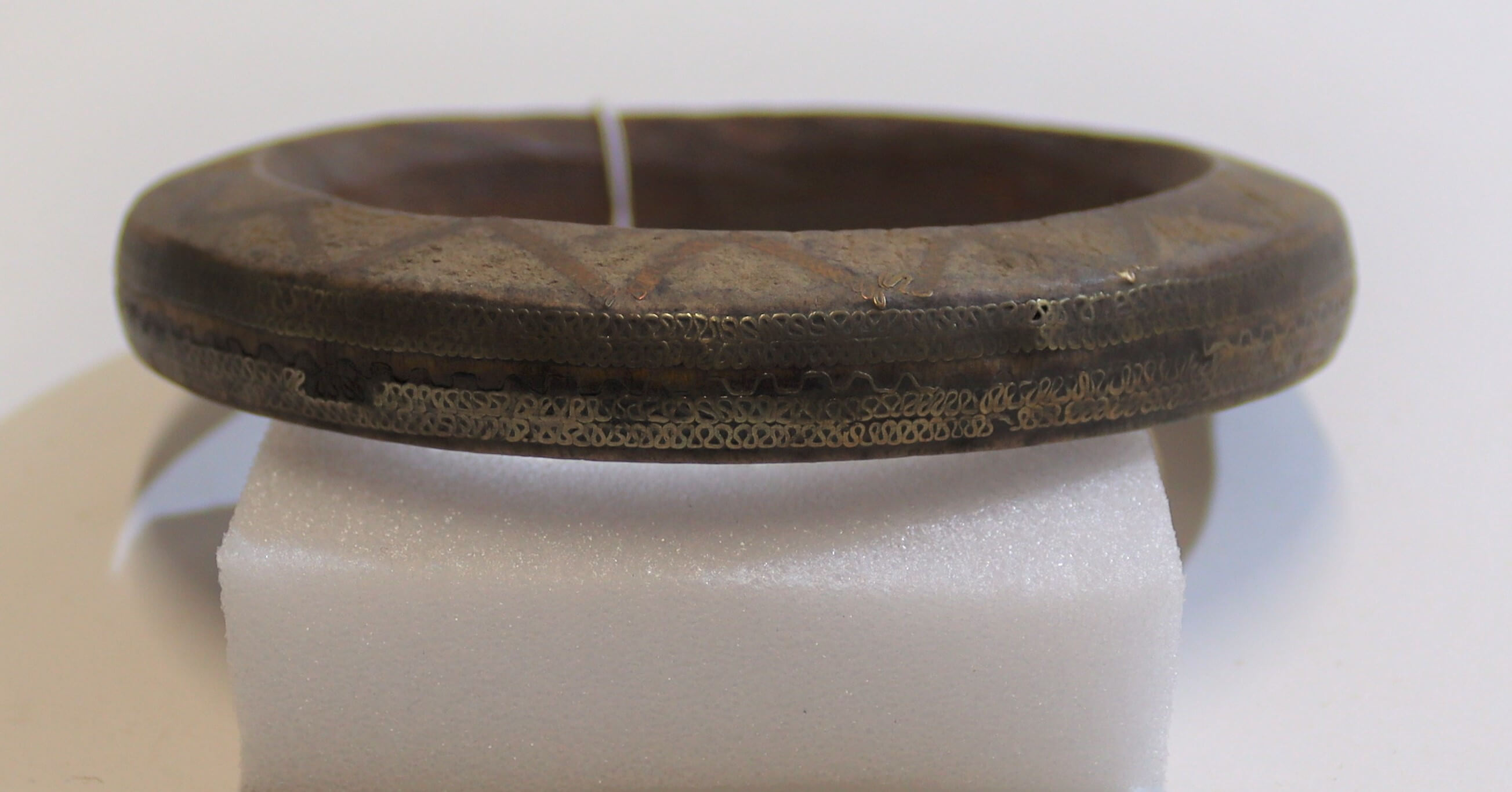 | Erweiterte Beschreibung | Die feinen Verzierungen des hölzernen Armrings sind mit dünnem Metalldraht eingelegt (Messing?). |
