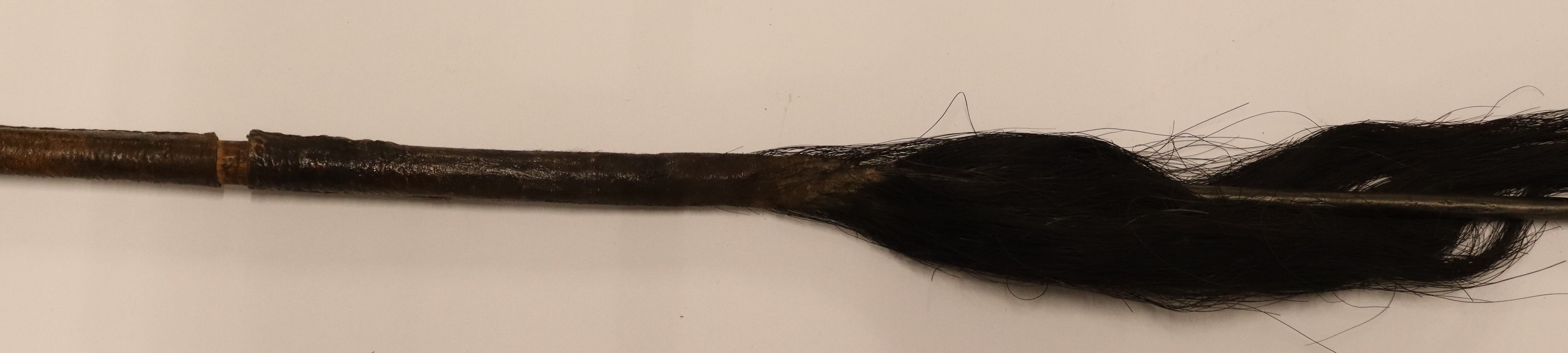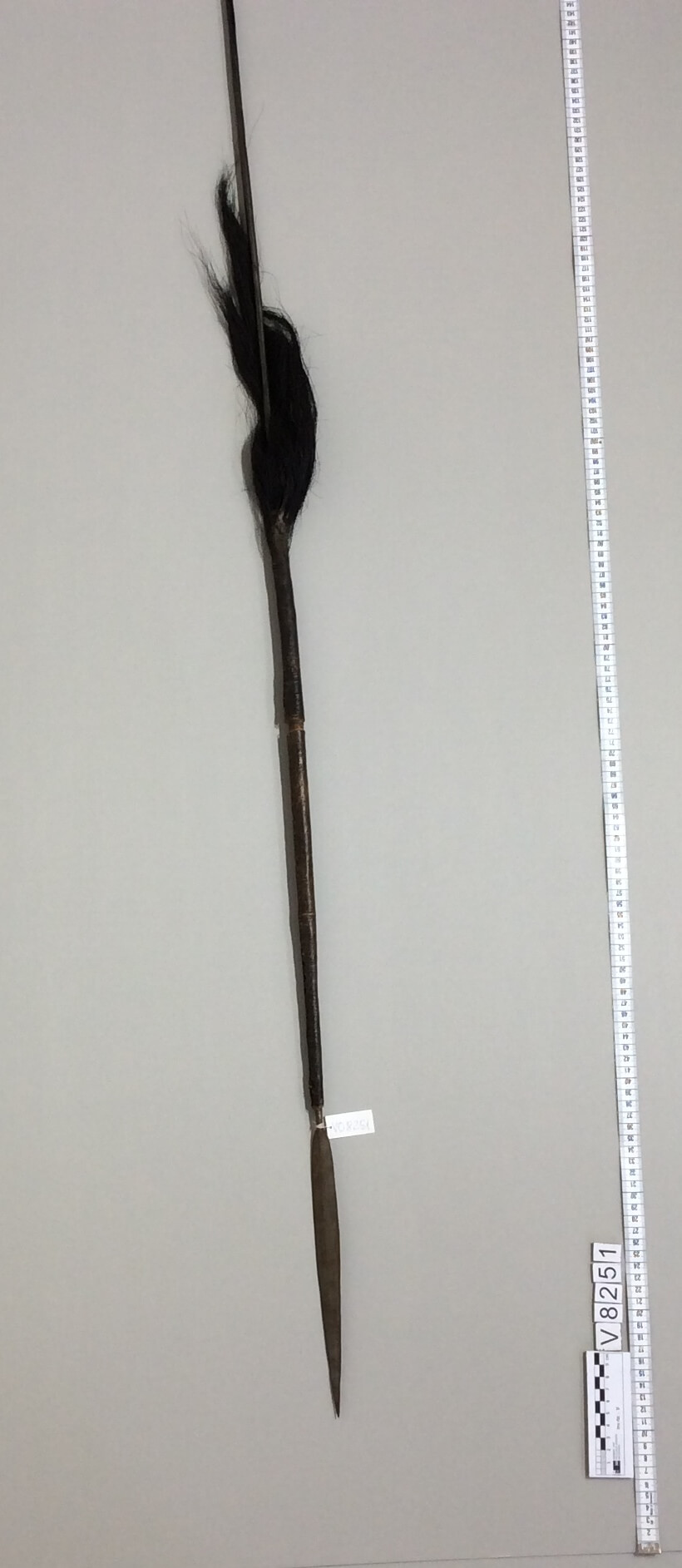 | Inventarbuch-Eintrag | Wurfspeer mit langer flacher Eisenspitze (Eisenblatt). Der Schaft besteht zur Hälfte aus Holz und einer Eisenstange. Die Holzpartie ist mit Fell bekleidet, die in einem langen schwarzen Haarbüschel endet. Geschenk von Herrn Eich, hier, 3.9.35. Herero, Waterberg, D.S.W. Afr. Geschenk Nr. 42/3/9/1935. |