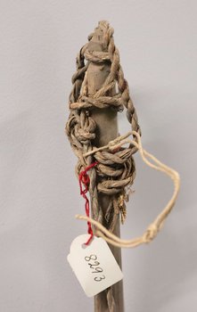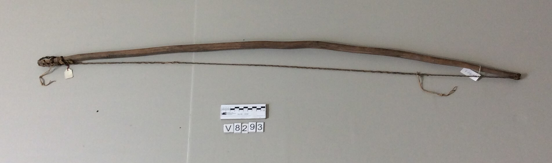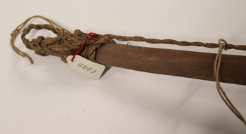 | Inventarbuch-Eintrag | Bogen mit Pflanzenfasersehne, schlichtes Naturholz und unbearbeitet. |