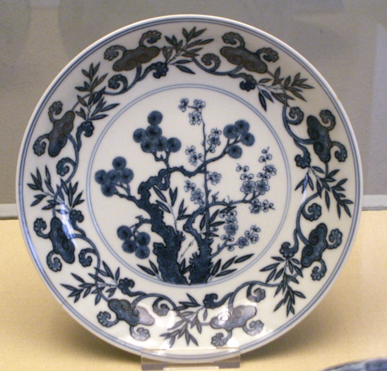 | Erweiterte Beschreibung | Im Inneren auf dem Grund in einem Medailon die "Drei Freunde des Winters", Kiefer, blühende Pflaume und Bambus, und auf der Innenwandung eine Ranke aus Lingzhi-Pilzen mit Bambus, die Bildzonen durch Doppelringe getrennt; auf der Außenwandung zwei Kiefern mit blühender Pflaume und Bambus über einer wellenartigen Schraffur auf dem Fußring. Die Sechs-Zeichen-Marke innerhalb eines Doppelrings ist in Unterglasurblau auf die Basis geschrieben. Es gibt einen identischen Teller, V 11020, bei dem der Blauton variiert. Qing-Dynastie (1644-1911), lt. Ohlmer-Führer 1932: Kangxi-Marke (1662-1722). Das Objekt ist im Katalog durch Ohlmers Sammlung unter der Nr. 234 (1932) und Nr. 97-99 (1898 Blauweiß) zu finden. |