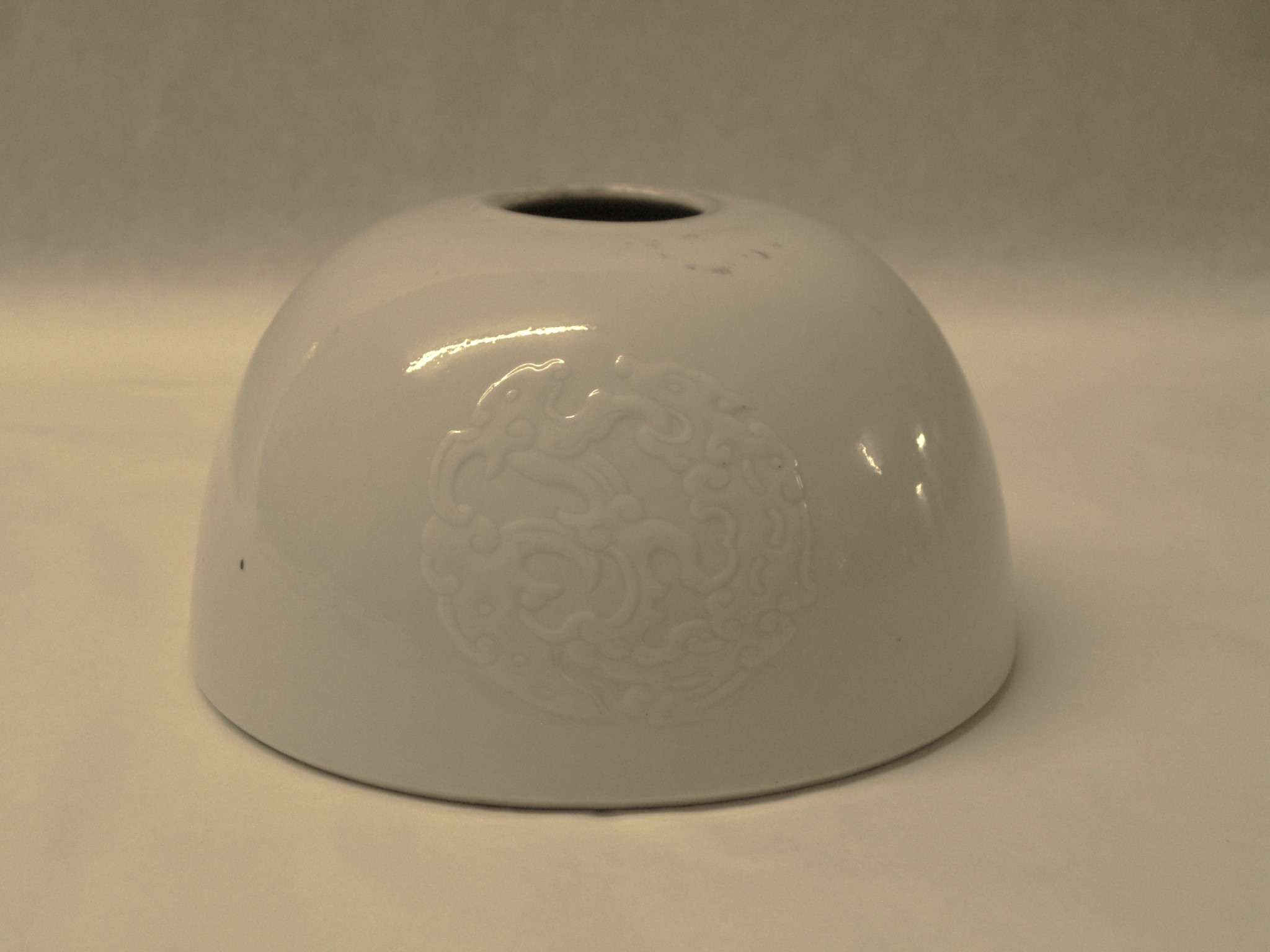 | Erweiterte Beschreibung | Tuschwassergefäß, so genannte Bienenkorb- oder Pferdefuß- (Ma'tsun) Form aus dickem weißen Porzellan; drei erhabene Medaillons mit zwei ineinander verbissenen Drachen. Kein Hals. Qing-Dynastie (1644-1911), lt. Ohlmer Kat. 1932: Kangxi-Marke (1662-1722); Das Objekt ist im Katalog durch Ohlmers Sammlung unter der Nr. 92 (1932) und Nr. 8 (1898 Bunt) zu finden. |