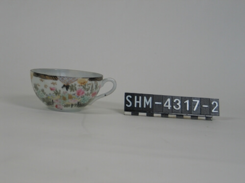 Erweiterte BeschreibungHergestellt in Japan oder von japanischer Firma. Motiv: sitzende Frau im grün-rosa Kimono, viel grün und Blüten, Ufer und fliegender Vogel, im Hintergrund Hütten und Berge .Rand schwarz-golden, am Henkel Reste von grüner Bemalung