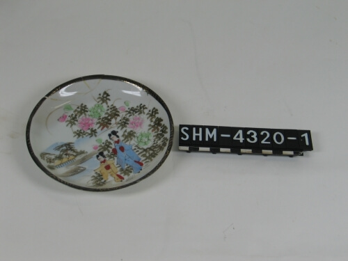 Erweiterte BeschreibungHergestellt in Japan oder von japanischer Firma. Teller, asiatisches Motiv. Rand schwarz mit goldenen Verzierungen. Motiv: zwei Menschen in kimonoähnlicher Kleidung am Ufer eines Gewässers, auf der anderen Uferseite Hütten. Die größere Person trägt blaue Kleidung mit rotem Kragen und Gürtel, die kleinere trägt gelbe Kleidung mit rotem Kragen und Gürtel. Auf der Rückseite dreieckähnliche Marke