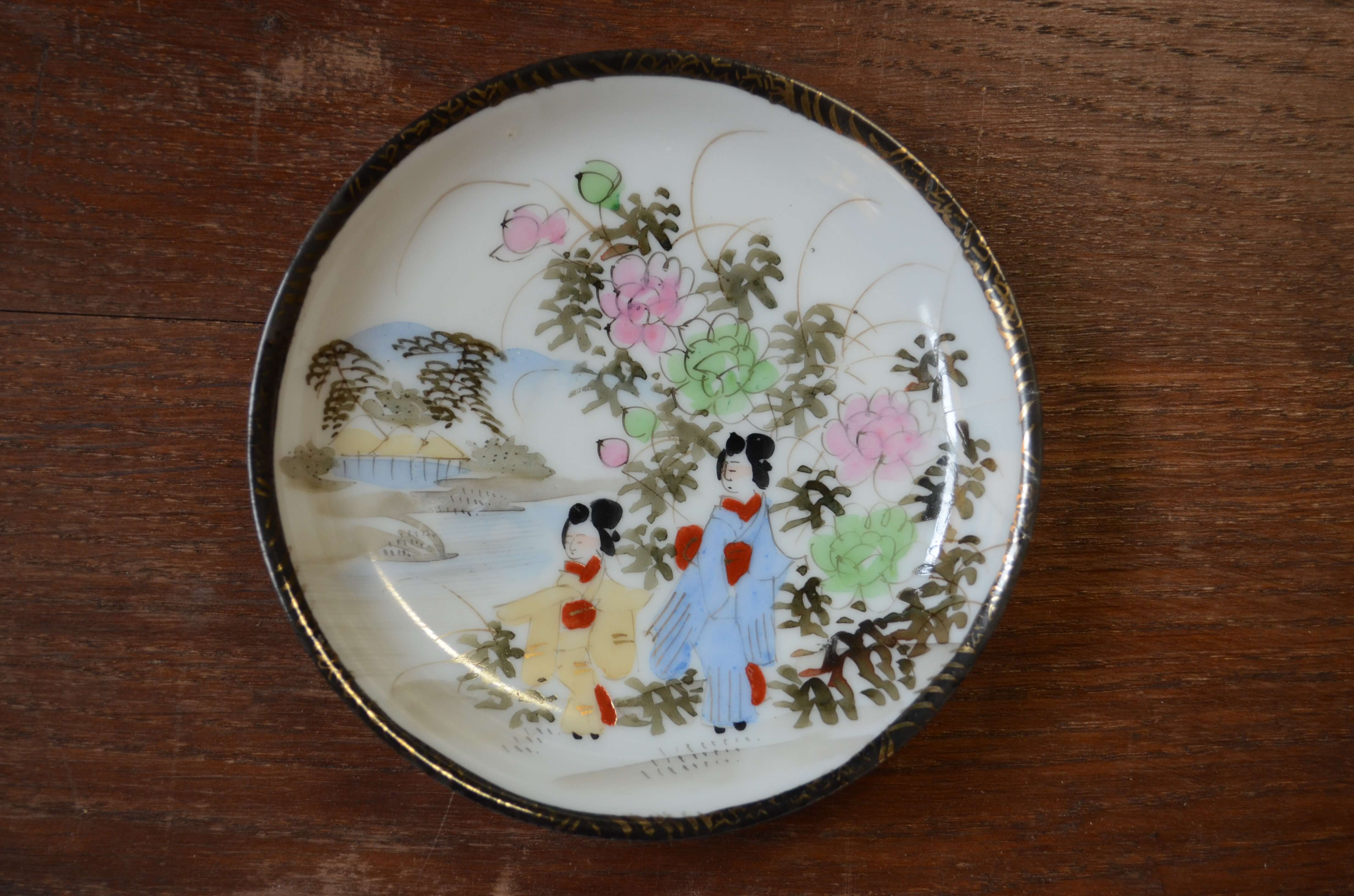 Erweiterte BeschreibungHergestellt in Japan oder von japanischer Firma. Kleiner Teller mit schwarzem Rand, Motiv: sitzende Frau am Ufer eines Gewässers, links über ihr ein fliegender Vogel, hinter ihr Blüten, Zweige
