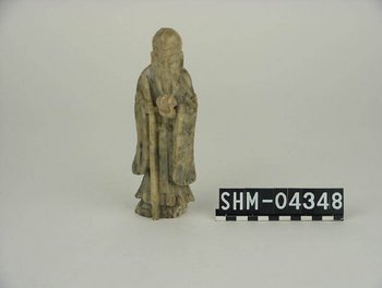 Erweiterte BeschreibungFigur. "Shou Hsing", Gott der Langlebigkeit und der Gesundheit. Er ist einer der "Unsterblichen" aus der chinesischen Mythologie. Figuren wie diese werden zusammen mit Figuren der anderen beiden Unsterblichen in Häusern aufgestellt und sollen Glück über das Haus bringen. Dargestellt wird "Shou Hsing" mit auffallend hoher Stirn und kahlem Schädel. In den Händen trägt er einen Stab aus Pfirsichholz und einen Pfirsich. Unter der Figur "1909" eingraviert. Grobe Arbeit für den Export als Souvenir. Vermutlich wurde die Figur auf einem Holzsockel aufgestellt, jedoch keine Spuren einer Verzapfung sichtbar