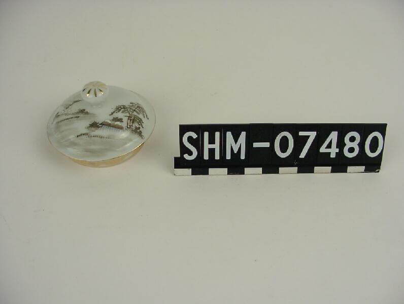 | Erweiterte Beschreibung | Hergestellt in Japan oder von japanischer Firma. Einzelteil, wahrscheinlich Deckel einer Teekanne: China, weißer, harter, Scherben über Engobe in blau-grau, braun bemalt, Deckelknauf mit Goldverzierung, Motiv: rechts Bäume darunter zwei Hütten, links stilisierte Berge |