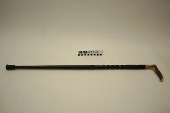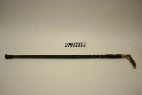 Erweiterte BeschreibungSpazierstock: schwarzes Ebenholz in einfacher Spirale gewunden, mit Horngriff, mit runden Horn-/Beineinlagen