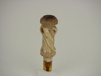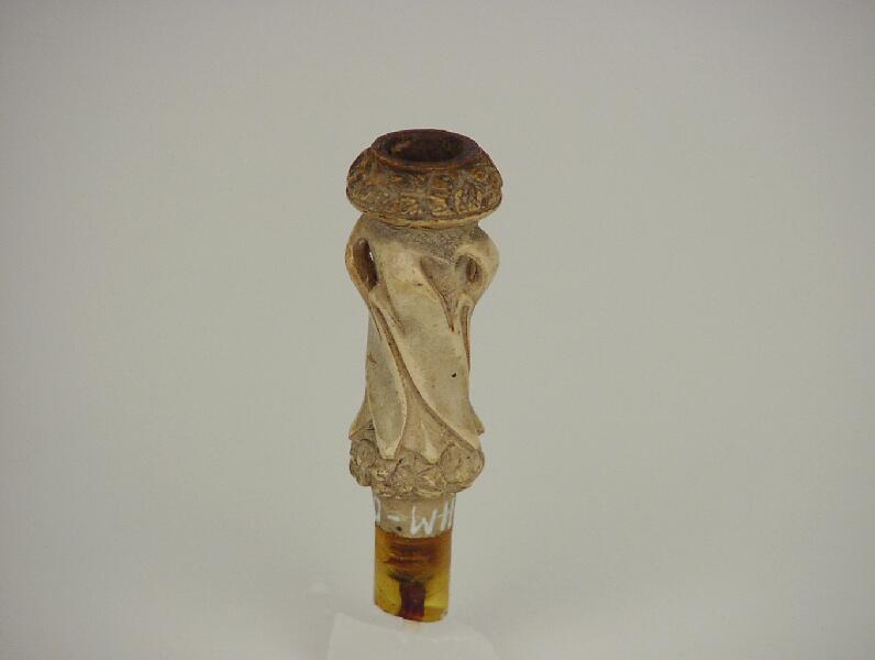 Erweiterte BeschreibungLaut leihvertrag: "Pfeifenkopf (leicht angebrochen), (Meerschaum?)". Pfeifenkopf einer Opiumpfeife: Bein, am Mundstück ausgebrochen