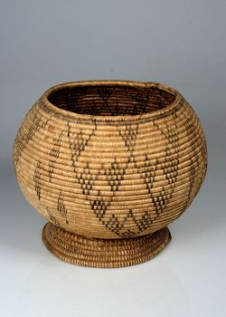| Erweiterte Beschreibung | Das helle Spiralwulstgeflecht ist mit Dreieckmotiven in dunkler Farbe verziert. Rote Farbe, wie auf der alten Karteikarte vermerkt, ist zumindest heute nicht mehr erkennbar. |