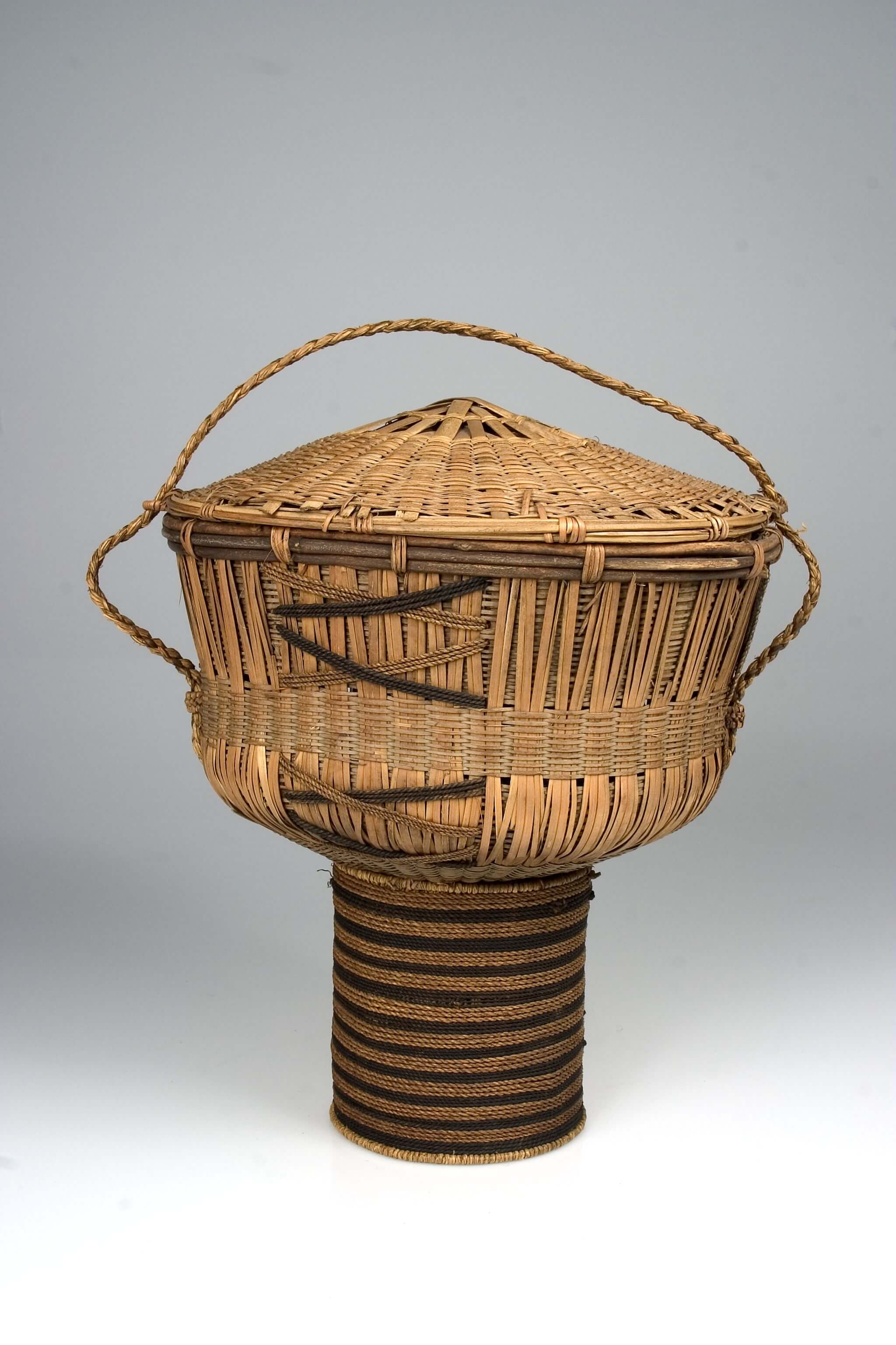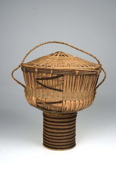 | Erweiterte Beschreibung | Der eigentliche Korb steht auf einem hohen Fuß aus Schnurgeflecht. Zwei verschiedene Farben von Schnüren wurden zur Verzierung des Korbes verwendet. Der Deckel ist durch eine Bastschnur, die durch Flechtösen am Korb gezogen ist, mit dem Korb verbunden. Bei Knöpfli 2008, S. 43, ist ein solcher Korb abgebildet, den eine Frau auf dem Kopf trägt. Er schreibt dazu: "Der einzigartige Korb der Aghem Volksgruppe und der angrenzenden Dörfer Weh und Esu ist kein Arbeitskorb. Er wird nur bei Festen innerhalb der Großfamilie und bei Besuchen gebraucht." |