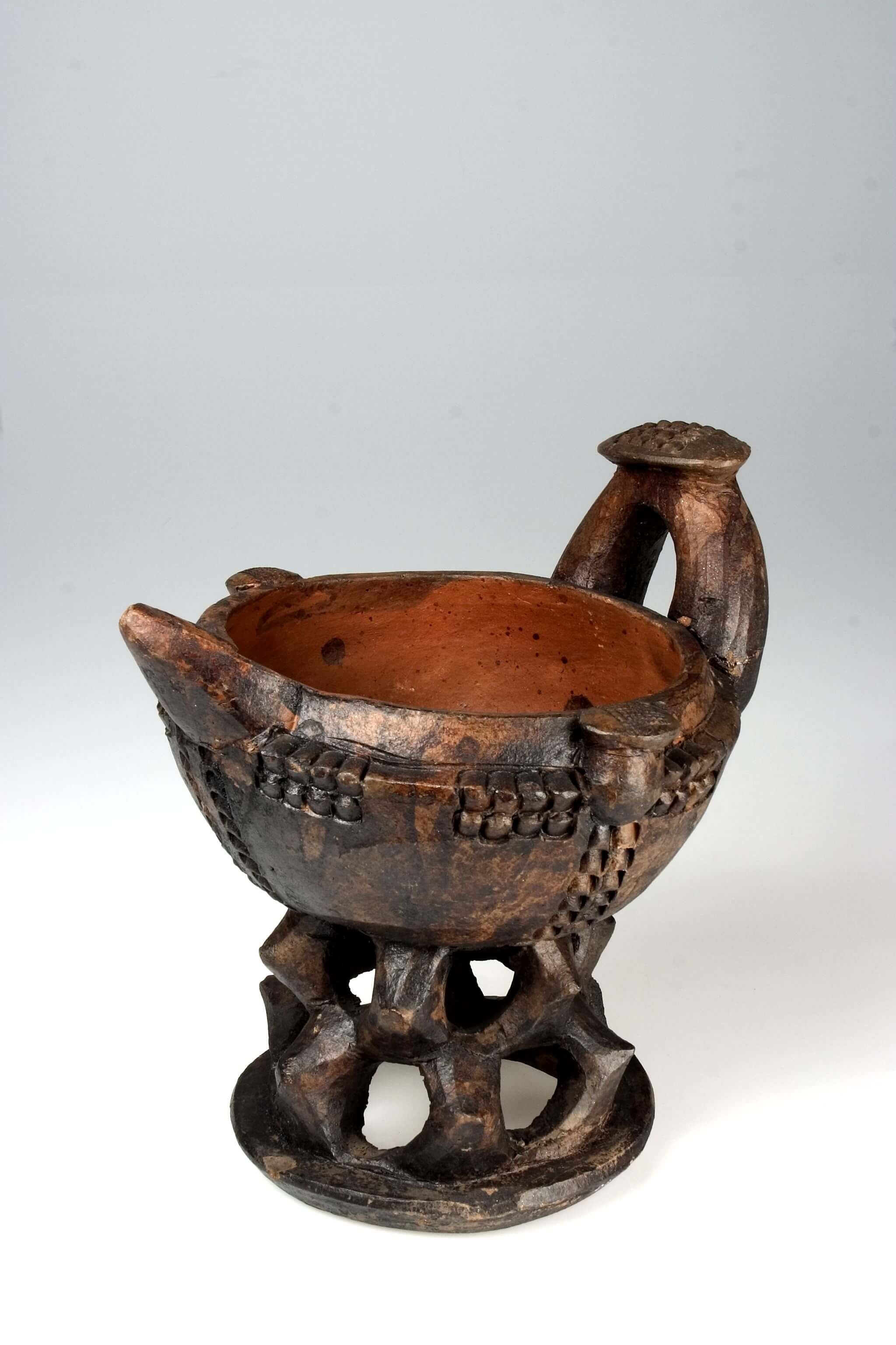 | Erweiterte Beschreibung | Rotes Terrakottagefäß, Außenwände geschwärzt. Mit Ausguss, Henkel und durchbrochen gearbeitetem Fuß, der an die aus Holz geschnitzten Schalen erinnert. Der Henkel ist geklebt. Essgefäß |