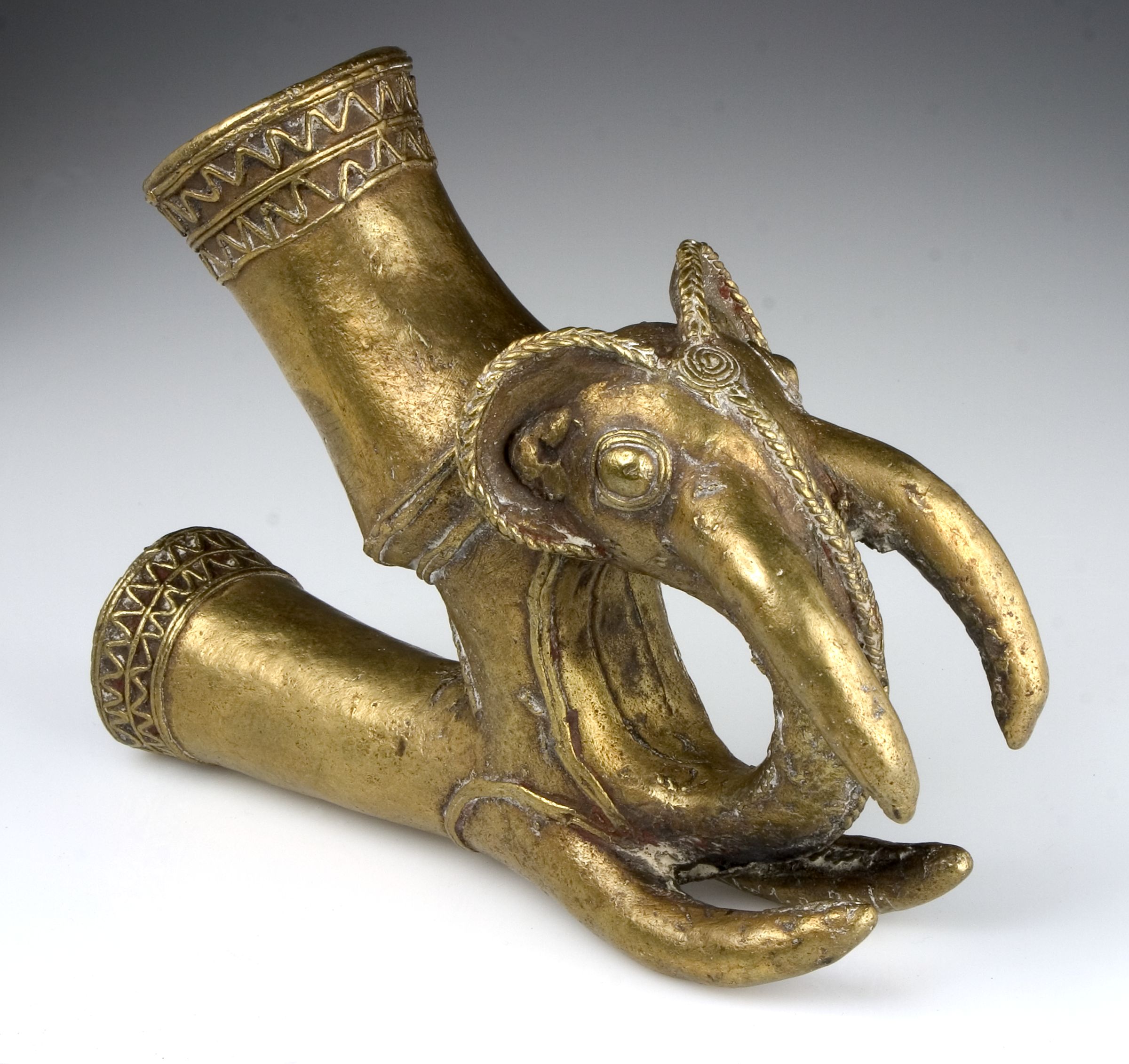 | Erweiterte Beschreibung | Elefanten-Pfeifenkopf. Der Elefant gehört zu den Symboltieren des Königs (Fon). In Homberger, Kamerun ... 2008, S. 154: "Die Könige und Chefs im Grasland liebten bronzene Pfeifenköpfe in Form von Elefantenköpfen. Der Elefant war ein Symbol des Königs und diesem allein vorbehalten. Obwohl solche Pfeifenköpfe von Bronzegiessern in verschiedenen Werkstätten der Region hergestellt wurden, stammten die besten aus dem Königreich Bagam, wo Bamum-Künstler eine sehr produktive Niederlassung gegründet hatten. Besonders auffallend ist hier das doppelte Paar Stoßzähne. Die unteren stabilisieren die Pfeife, wenn sie auf dem Boden steht...." |