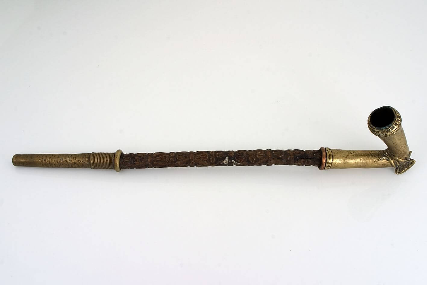 | Erweiterte Beschreibung | Pfeifenkopf und Mundstück sind aus Messing, das Pfeifenrohr aus Holz, dessen Umwicklung mit Zinnfolie nur noch vereinzelt vorhanden ist. Zwischen dem Pfeifenkopf und dem Holzrohr ist ein Kupferring eingefügt. |