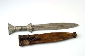 | Erweiterte Beschreibung | Dolch in Lederscheide mit Eisenklinge und einem Holzgriff, der mit Zinnfolie überzogen ist. Die Schreibweise der kulturellen Zuschreibung variiert in den Quellen; auf den alten Karteikarten im Museum wird überwiegend die Bezeichnung "Bangua" verwendet. |