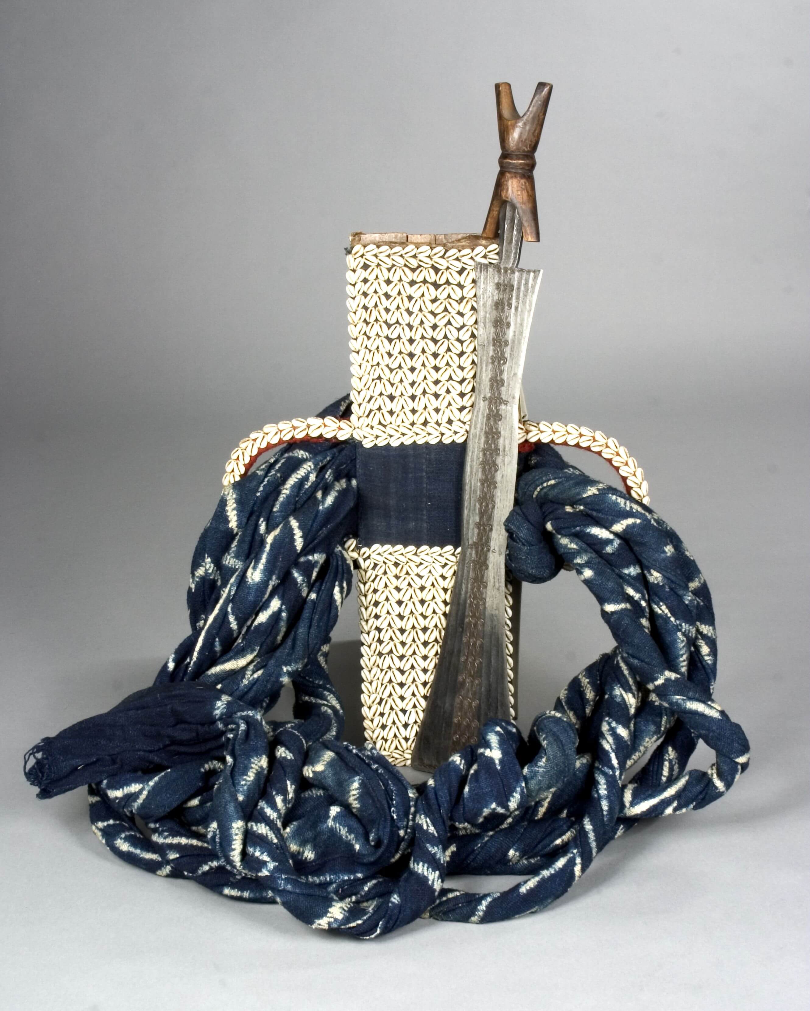 | Erweiterte Beschreibung | Prestige-Schwert mit breiter Klinge und x-förmigem Holzgriff, Die Scheide ist einschließlich der griffe mit Kaurischnecken verziert. Die Rückseite ist schlicht mit blauem Stoff überzogen, die Griffe mit rotem Stoff. Die Schärpe ist aus blauem Baumwollstoff mit weißem Muster. Wird bei Feierlichkeiten getragen. Alte Karteikarte: "Kurzes Schwert in Scheide mit Gehänge. Die Klinge ist längs der Mitte mit eingravierten hübschen Ornamenten verziert, der Griff besteht aus schwarzem Holz. Die flache Holzscheide ist auf der Oberseite mit einer Schwarzen Kittmasse (Art Gummi) beklebt, welche dicht mit Kauris befaßt ist. Rückseite mit Tuch überzogen. Durch die seitlichen weiten Ösen ist ein ungeheuer langes Gehänge aus zusammengewebtem Baumwollzeug befestigt." Das "Gehänge" wird über der Schulter getragen. |