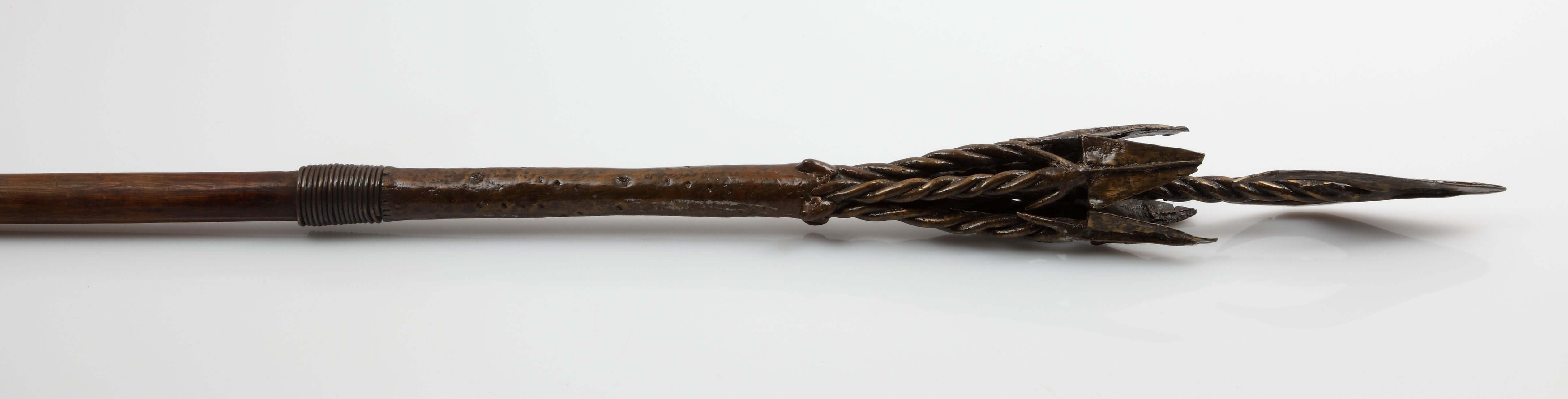 | Erweiterte Beschreibung | Alte Karteikarte: "Häuptlingsspeer mit Kupfer- (Bronze-) Spitze, altes Prachtstück von Metallarbeit." Von den 5 seitlichen Speerspitzen ist eine abgebrochen. Die Spitzen sind aus Gelbguss, darunter Kupferdraht. Am Ende des Schafts ist eine Eisendrahtumwicklung |