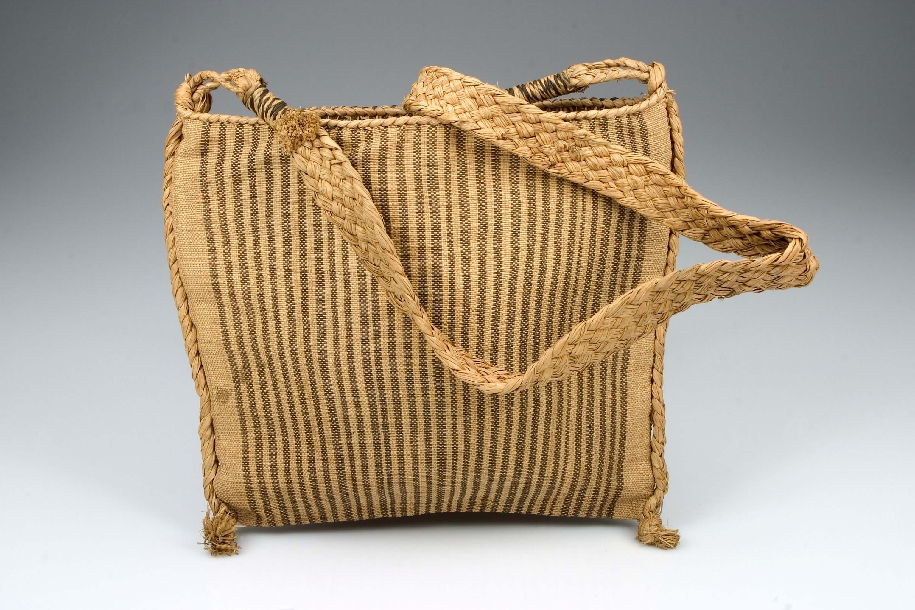 | Erweiterte Beschreibung | Beschreibung auf alter Karteikarte: "4eckige, schwarz gestreifte, aus Pflanzenfasern gewebte Tasche mit Tragband" Raphiataschen wurden von Männern gewebt und galten ähnlich wie bestickte Gewänder als Statussymbole. Fein verarbeitete Taschen wurden von Würdenträgern für ihre Insignien benutzt und konnten spirituelle Bedeutung haben. Die Schreibweise der kulturellen Zuschreibung variiert in den Quellen; auf den alten Karteikarten im Museum wird überwiegend die Bezeichnung "Bangua" verwendet. |