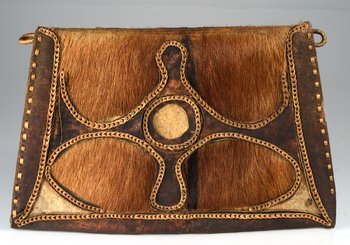 | Erweiterte Beschreibung | Alte Karteikarte: "Jagdtasche aus Fell. Auf der äußeren Klappe ist über das Fell, letzteres aber an 4 Stellen zeigend, bläulich getöntes Leder aufgenäht." Blaue Farbe ist heute nicht mehr zu erkennen. Die Lederapplikationen sind mit einem Kettenstich auf der Tasche befestigt. Die Rückseite besteht ausschließlich aus rötlichem Fell. Zwei Schlaufen an den Seiten der Tasche ermöglichen eine Befestigung oder das Durchziehen eines Tragriemens. |