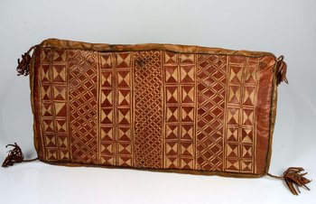 | Erweiterte Beschreibung | Auf der Vorderseite ist ein durch Schältechnik (Radiertechnik) gearbeitetes Muster aus hellen und dunklen Ornamenten, die Rückseite ist schwarz mit einem einfachen Schlitz in der Mitte zum Füllen der Polsterung. Die Seiten sind hell eingefasst und an allen vier Ecken mit Lederquasten versehen. |
