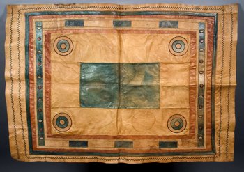| Erweiterte Beschreibung | Auf der alten Karteikarte ist ursprünglich nur eine entsprechende Decke aufgeführt, es wurden jedoch zwei fast identische Schabracken aufgefunden. Anmerkung auf der alten Karteikarte: „Schabracke, in 4farbigem Ledermuster (sehr schön) (Naturfarben, rothbraun, gelb, grün). Dikoa (Marktpreis 1 M. T. Thaler). Feine Lederarbeit von Bornuleuten (Kanuri).“ Die Musterung besteht sowohl aus Applikationen wie aus Lederbändchenstickerei. |
