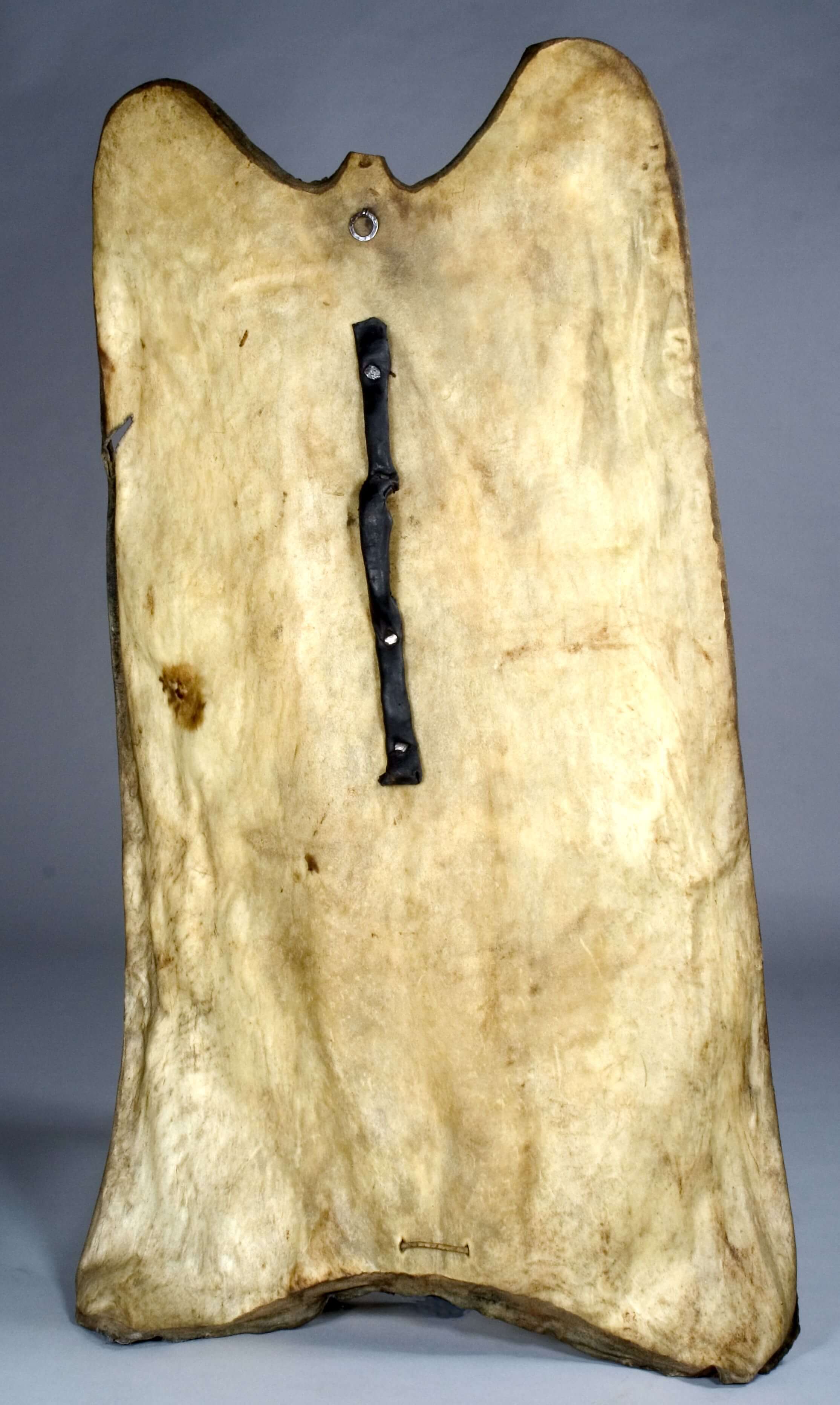 | Erweiterte Beschreibung | Anmerkung auf der alten Karteikarte: „Großer Schild aus Rindshaut. Wadai (Sahara), Tubu-Stamm, Berge nördlich von Wadai (vom Sultan von Mandara erhalten; Strümpell sah selbst nie solche Schilde. Roh bearbeitete gelbliche Rinderhaut, mit Ornamenten in flachem Kerbschnitt und 4 Messingknöpfen als Verzierung.“ Auf der Vorderseite mit der Ritzornamentik sind ein quadratisches und vier runde Messingscheiben untereinander angeordnet. Die durchbrochen gearbeiteten runden Scheiben sind mit rotem Stoff unterlegt. Auf der Rückseite ist auf Höhe der quadratischen Scheibe ein eiserner Ring angebracht, während die runden Messingscheiben auf der Rückseite mit eisernen Nägeln einen dunklen Ledergriff halten. |