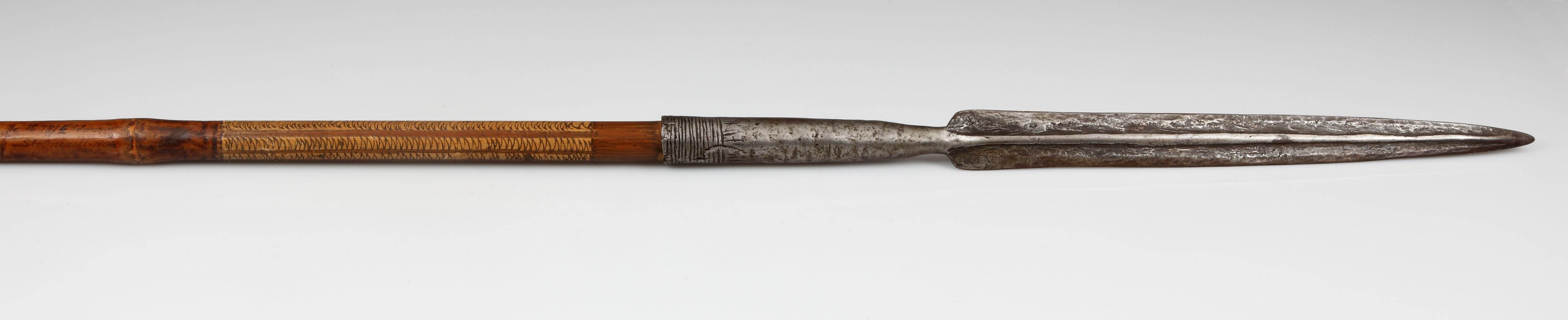 | Erweiterte Beschreibung | Anmerkung auf der alten Karteikarte: “Reiterlanzen. Deutsch Adamaua" Mit Kerbschnitzerei am Schaft und Eisenschuh |