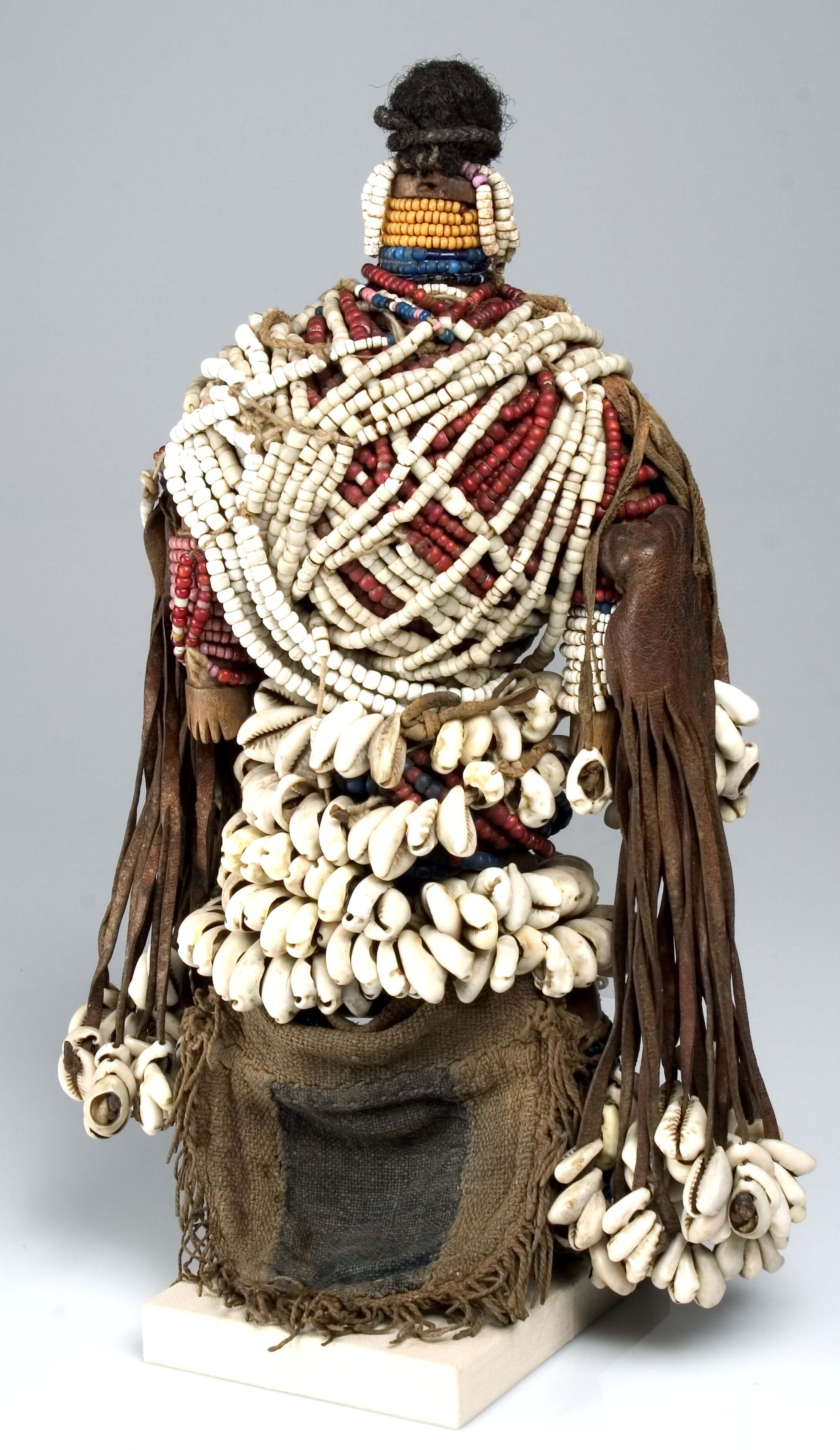 | Erweiterte Beschreibung | Die Bezeichnung "Namtschi-Heiden" oder "Namschi" wurde in der Kolonialzeit, so auch in der Museumsdokumentation am SMBS, als ethnische Kategorie verwendet und schloß die Dowayo sowie Duupa mt ein. Der Begriff "Namtschi" ist abwertend und geht auf eine Fremdbezeichnung der Fulbe für nichtislamisierte Gruppen zurück, deren Angehörige von Fulbe-Herrschern versklavt wurden. Der Zusatz "Heiden" weist darauf hin, dass es sich um eine nichtislamische Gruppe handelte; die Fulbe-Herrschaft nicht anerkannten und nicht zum Islam konvertierten (IB 2021). Anmerkung auf der alten Karteikarte: „Fetisch-Puppe für Frauen, reich mit Glasperlen u. Kauris etc. verziert. ‚Als Zauber für Frauen gegen Unfruchtbarkeit angefertigt u. getragen’, Strümpell. Das Gestell ist …Statur, aber aus Hartholz; 2 Striche als Andeutung der Vulva. Kopf aus einem Büschel natürlicher Haare. - Hals, Arme u. Beine mit Schnüren kleiner Glasperlen umwunden (gelbe, blaue, grüne, weiße, rosa und rot; - auf jeder Schulter 2 Stückchen Leder in zahlreiche dünne Streifchen geschnitten, mit einer oder mehrerer Kauris am Ende verziert. - Rumpf kreuzweise mit Schnüren weißer (z. T. sehr alter) u. roter etwas größerer Glasperlen. – Um Leib: 6 Schnüre aufgereihter Kauris (cypraea moneta u. annulus) – Schamschurz aus altem Lappen. – Unter den Glasperlen sind wieder sehr alte, vielleicht auch alte weiße Alabasterperlen.“ Solche Puppen werden von den Frauen auf dem Rücken getragen, wenn sie sich Kinder wünschen. |