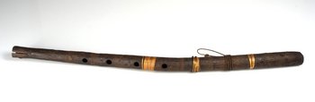| Erweiterte Beschreibung | Anmerkung auf der alten Karteikarte: „Flöte aus einer etwas gebogenen Röhre aus Rinde, mit einigen Ringen aus gespaltenem Rohr; 4 Löcher.” Eine Schnurumwicklung dient als Traghilfe. |