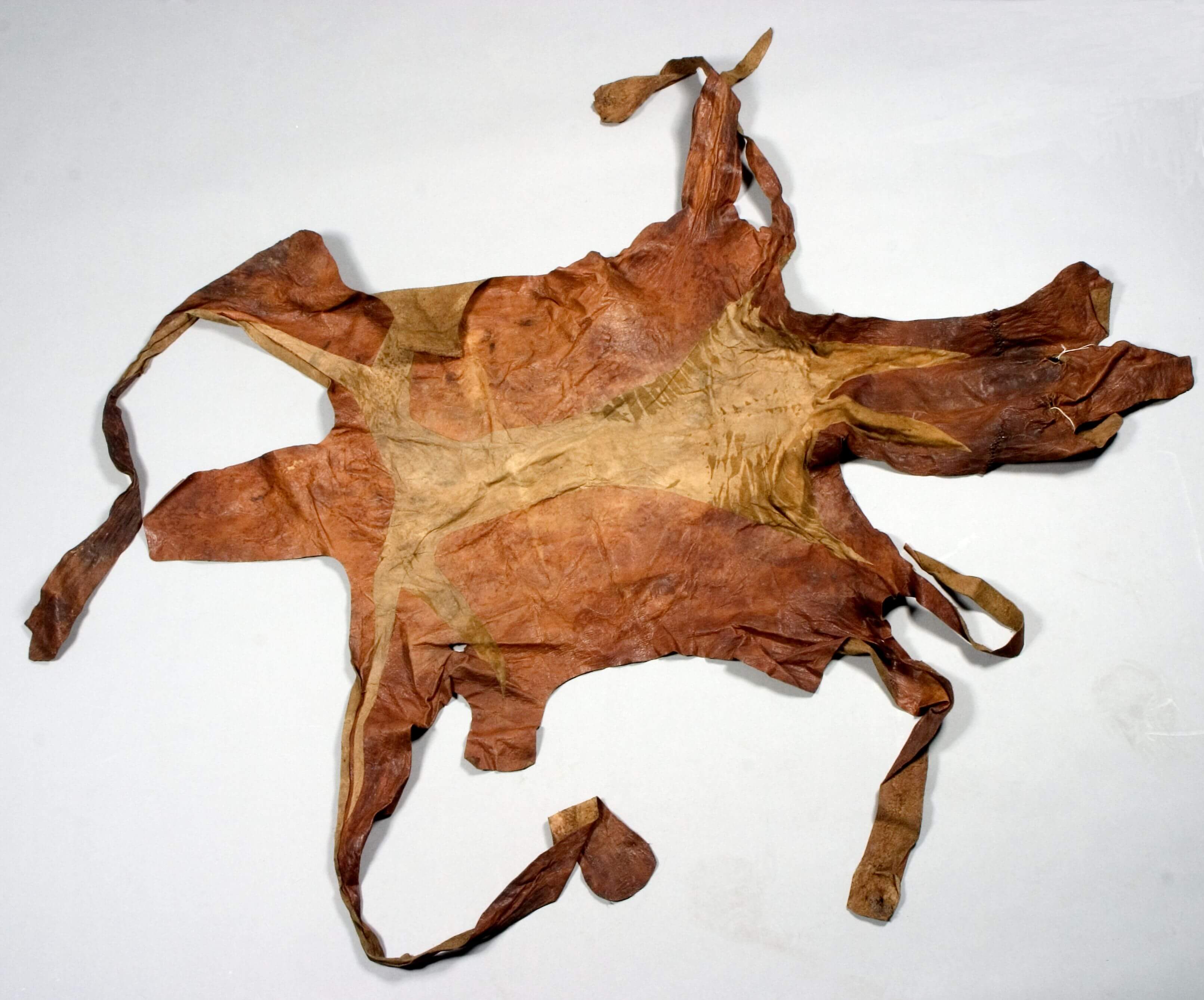 | Erweiterte Beschreibung | Anmerkung auf der alten Karteikarte: „Gegerbtes Fell (wohl Ziege) mit Teil der Beine. Wohl gefärbt, mit weißem Muster in der Mitte (gewöhnliche Sorte).“ Das hellere Leder in der Mitte des Schurzes ist durch Abschälung entstanden. Als ethnische Zuordnung ist auf der kolonialzeitlichen Karteikarte "Lam-Heiden" angegeben. Lam heißt heute ein Ort im Departement Mayo-Louti in der Region Nord. Er liegt neben Guider und wird überwiegend von den Guidar bewohnt. Demnach kann das Objekt auf die Guidar zurückgehen (Tevodai Mambai und Isabella Bozsa, 8.09.2021). |