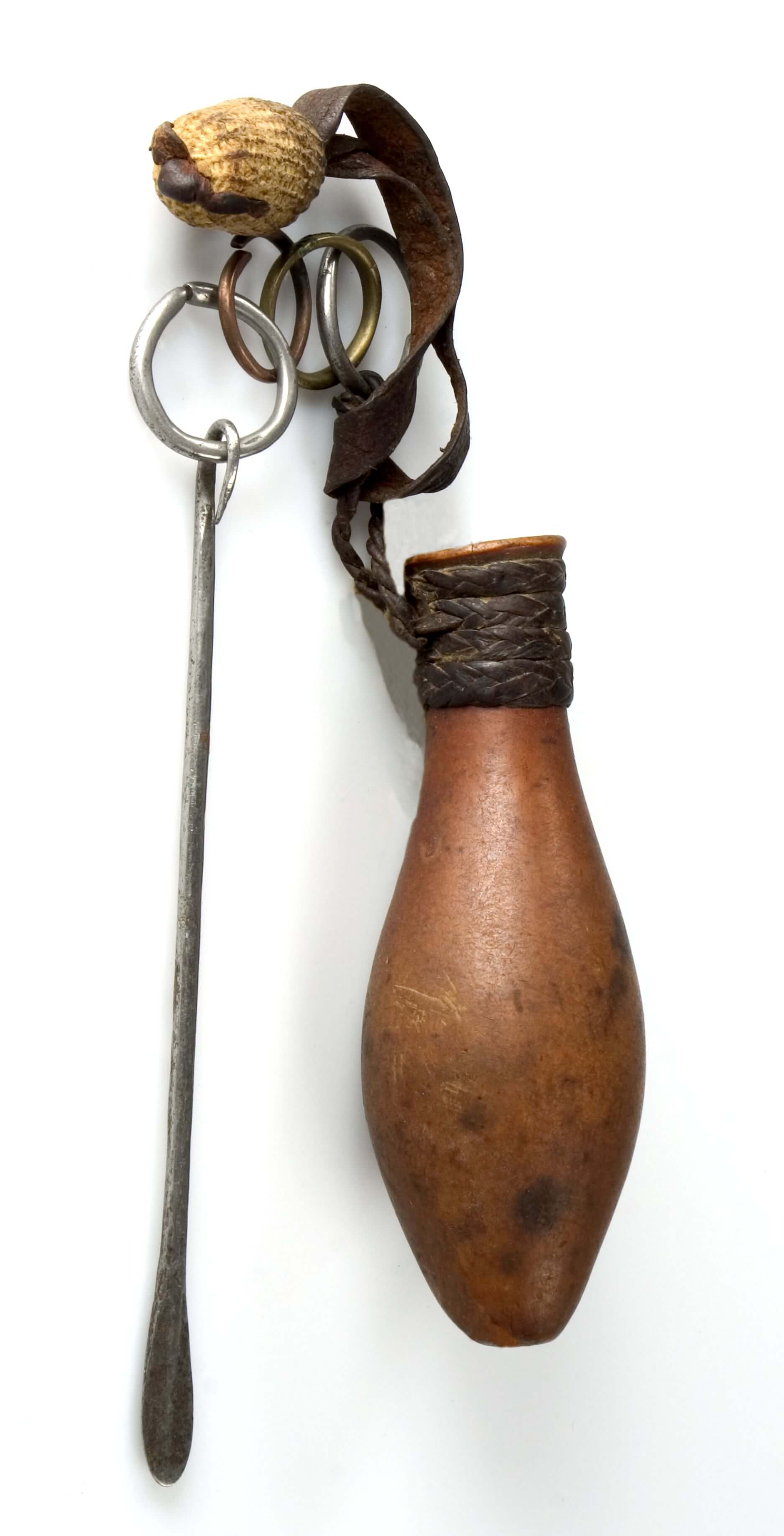| Erweiterte Beschreibung | Anmerkung auf der alten Karteikarte: „Tabakbehälter, kleine birnenförmige Kalebasse mit Lederriemen, an dem 4 Ringe u. Pfeifenreiniger aus Eisen." Die Kalebasse ist mit Leder umwickelt. An dem Lederband hängen vier Ringe aus Eisen, Messing und Kupfer, woran der Pfeifenstopfer befestigt ist. An einem weiteren Lederband hängt eine eichelförmige Flechtkugel. Als ethnische Zuordnung ist auf der kolonialzeitlichen Karteikarte "Lam-Heiden" angegeben. Lam heißt heute ein Ort im Departement Mayo-Louti in der Region Nord. Er liegt neben Guider und wird überwiegend von den Guidar bewohnt. Demnach kann das Objekt auf die Guidar zurückgehen (Tevodai Mambai und Isabella Bozsa, 8.09.2021). |
