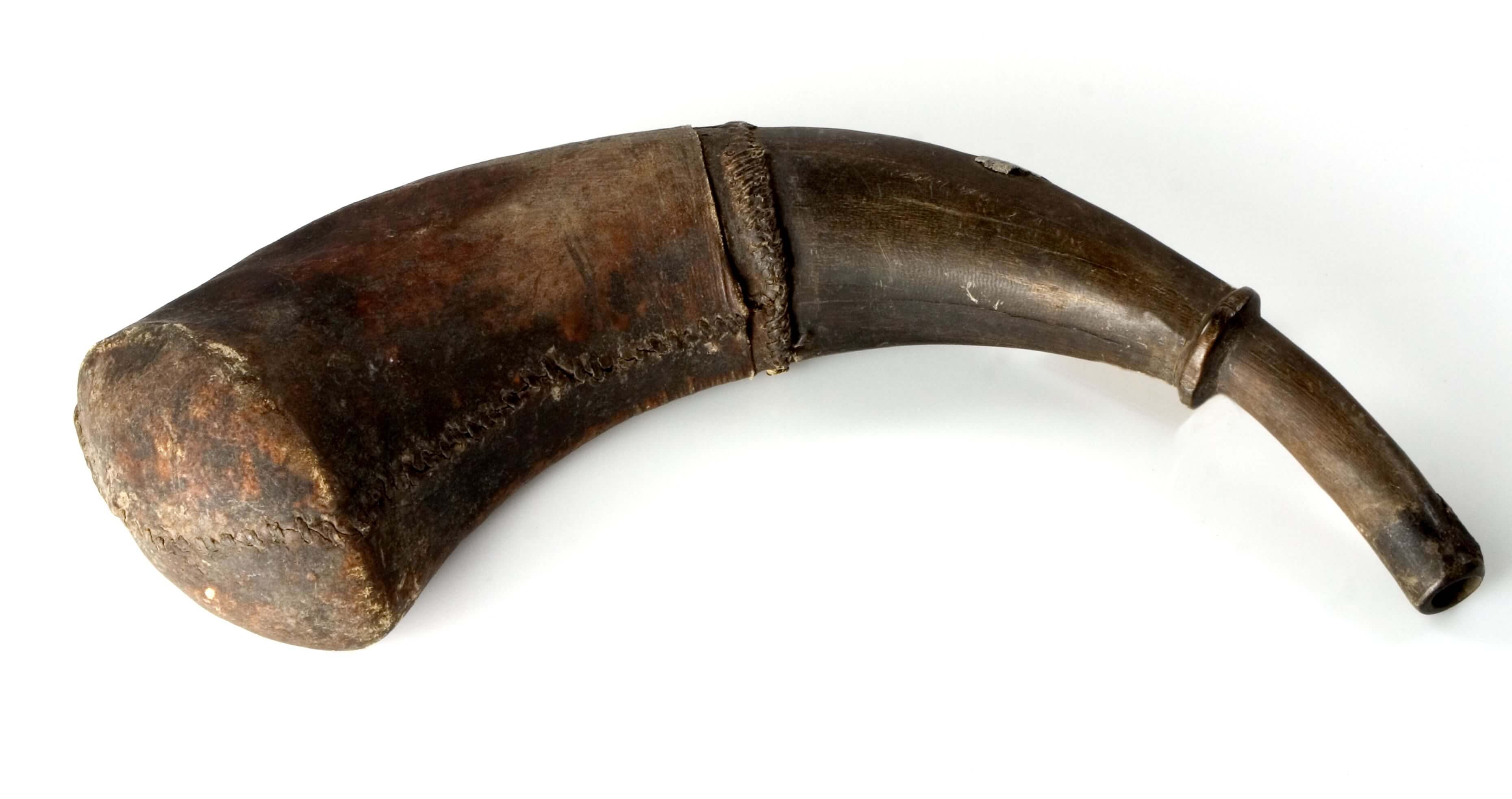 | Erweiterte Beschreibung | Anmerkung auf der alten Karteikarte: „Scheint Büffelhorn, sehr groß, vielleicht ursprünglich Pulverhorn.“ Auf dem Teil, der nicht mit Leder überzogen ist, befindet sich ein Rest von aufgeklebtem Zinn. Im Lederteil ist eine Öse für eine Aufhängung oder ein Tragband. Als ethnische Zuordnung ist auf der kolonialzeitlichen Karteikarte "Lam-Heiden" angegeben. Lam heißt heute ein Ort im Departement Mayo-Louti in der Region Nord. Er liegt neben Guider und wird überwiegend von den Guidar bewohnt. Demnach kann das Objekt auf die Guidar zurückgehen (Tevodai Mambai und Isabella Bozsa, 8.09.2021). |