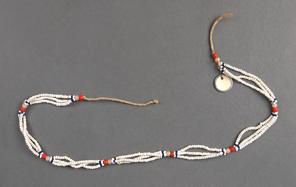 | Description | weiß, blau, rot, auf Fäden gezogen; offene Enden |