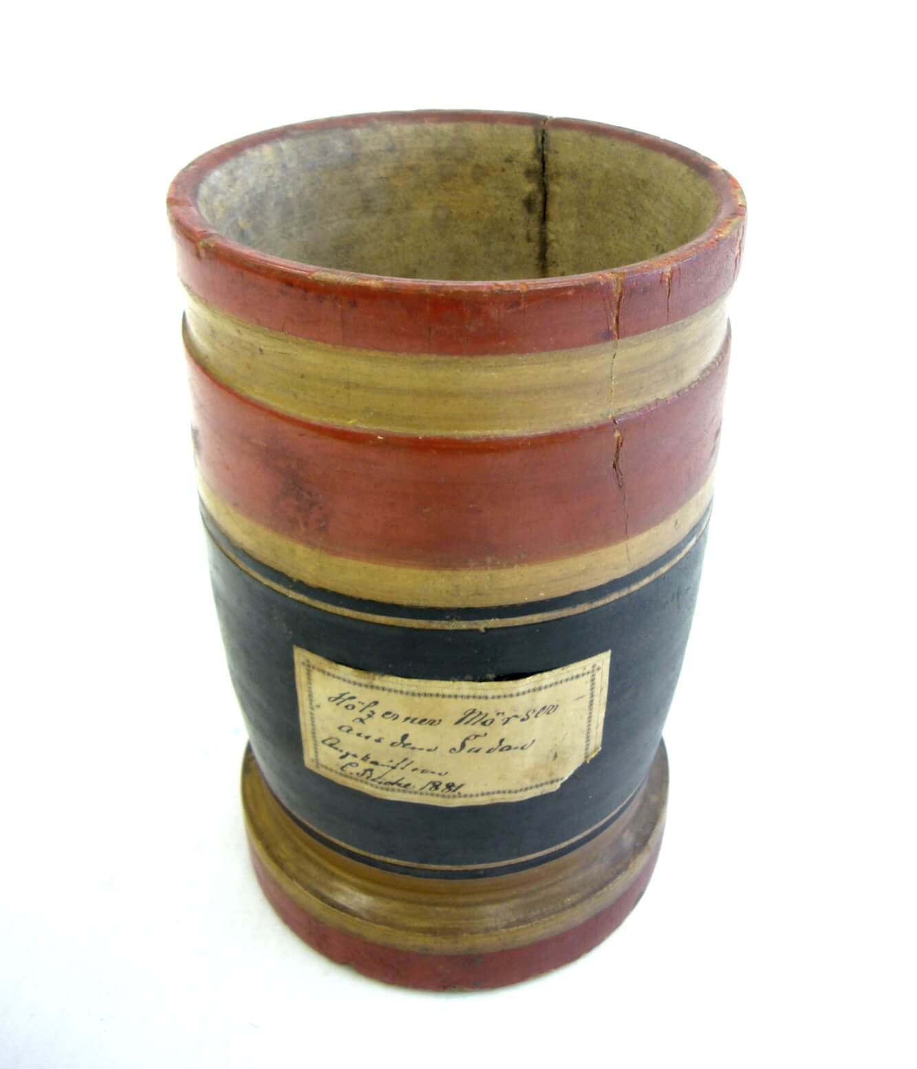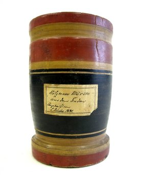 | Description | Mörser, gedreht und mit Ölfarbe bemalt. Das Objekt wurde mit hoher Wahrscheinlichkeit im Kontext der vom Tierhändler Carl Reiche, Alfeld, organisierten Schau „Reiche’s Karawane aus Nubien“ (1879) nach Deutschland verbracht. Die Objekte haben daher die kulturelle Zuschreibung "Nubier" erhalten. |