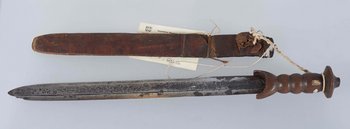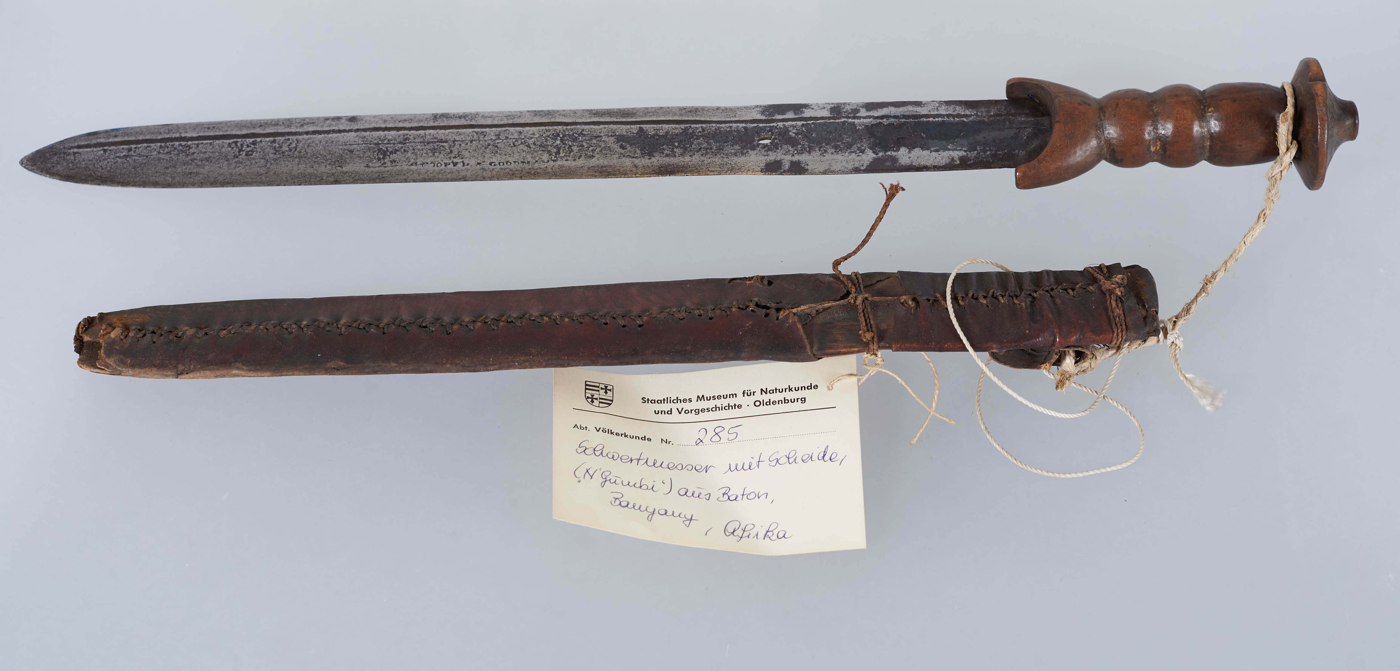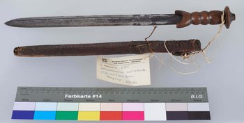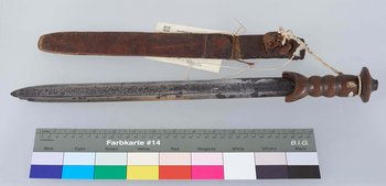 | Description | Gerade, zweischneidige Klinge in Schwertform. Auf einer Seite verläuft eine Hohlkehle. Die zum Schwert hingebogene Parierstange, genauso wie der Griff und der pilzartige Knauf sind aus Holz gearbeitet. Auf der Klinge lässt sich eine Prägung erkennen, vermutlich "Cooper & Goodman". Die Scheide besteht aus mit Leder umspannten Holz. Erhalten vom Museum für Völkerkunde Berlin, aus der "Sendung der Kamerun-Expedition (Dr. Zintgraff)". Im entsprechenden Verzeichnis wird das Objekt als "Schwertmesser mit Scheide N'Gumbi" bezeichnet und unter Herkunft "Batom (Banyang)" angegeben. |