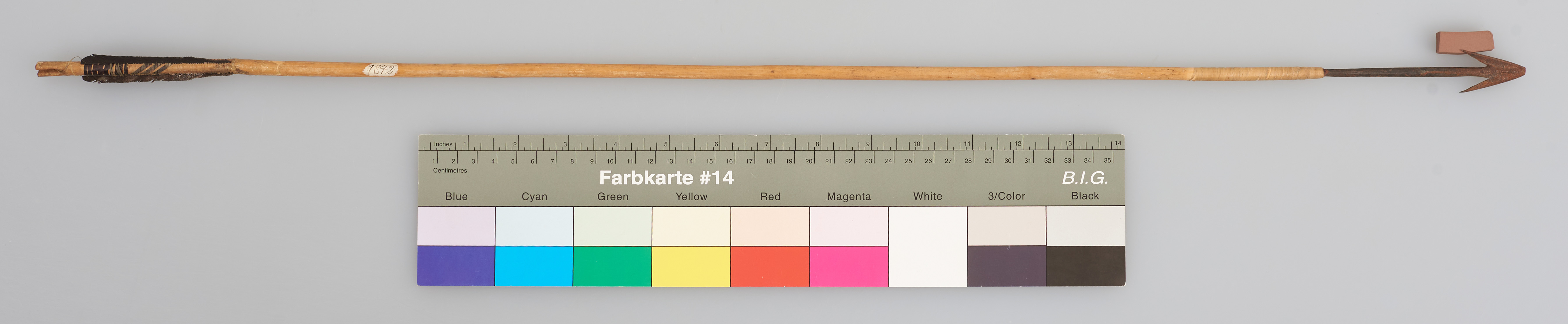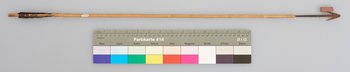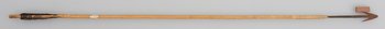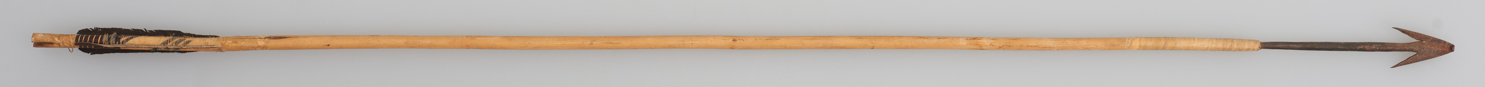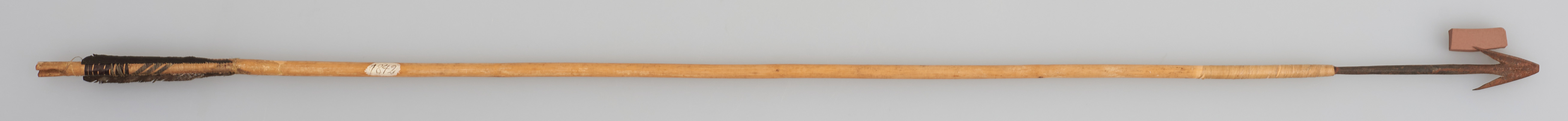 | Description | Pfeil mit Holzschaft, Metallspitze mit 2 Widerhaken und Flugsicherung. |
