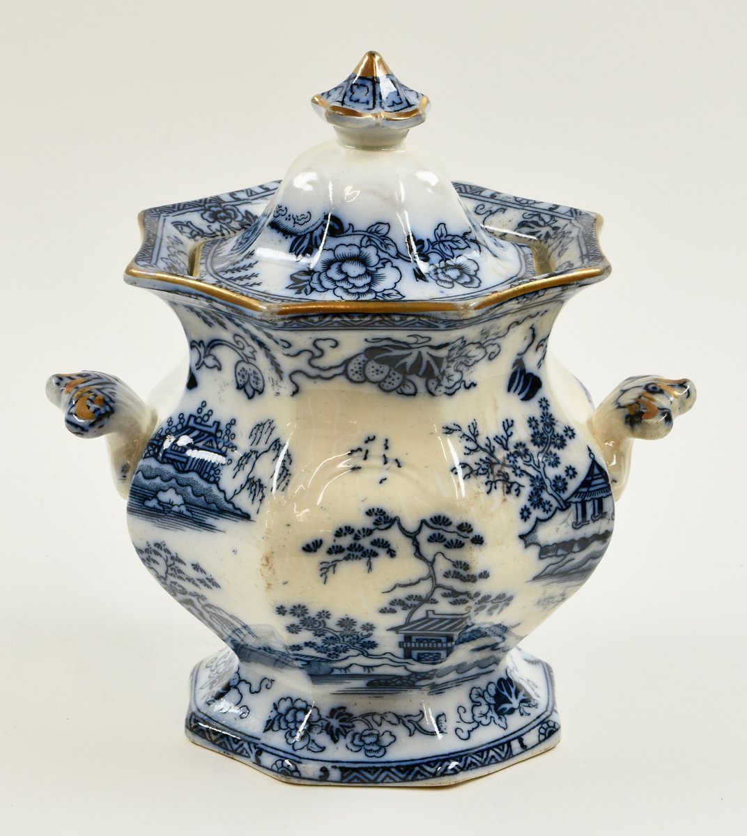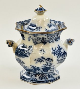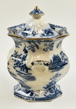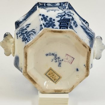 | Description | Topf mit Deckel, weiß glasiert, bauchige, achteckige Form mit zwei Griffen, weiß-blaue Malerei mit verschiedenen Landschaftsdarstellungen. Unterseitig Herstellermarke HONGKONG + Stempel + Symbol. |