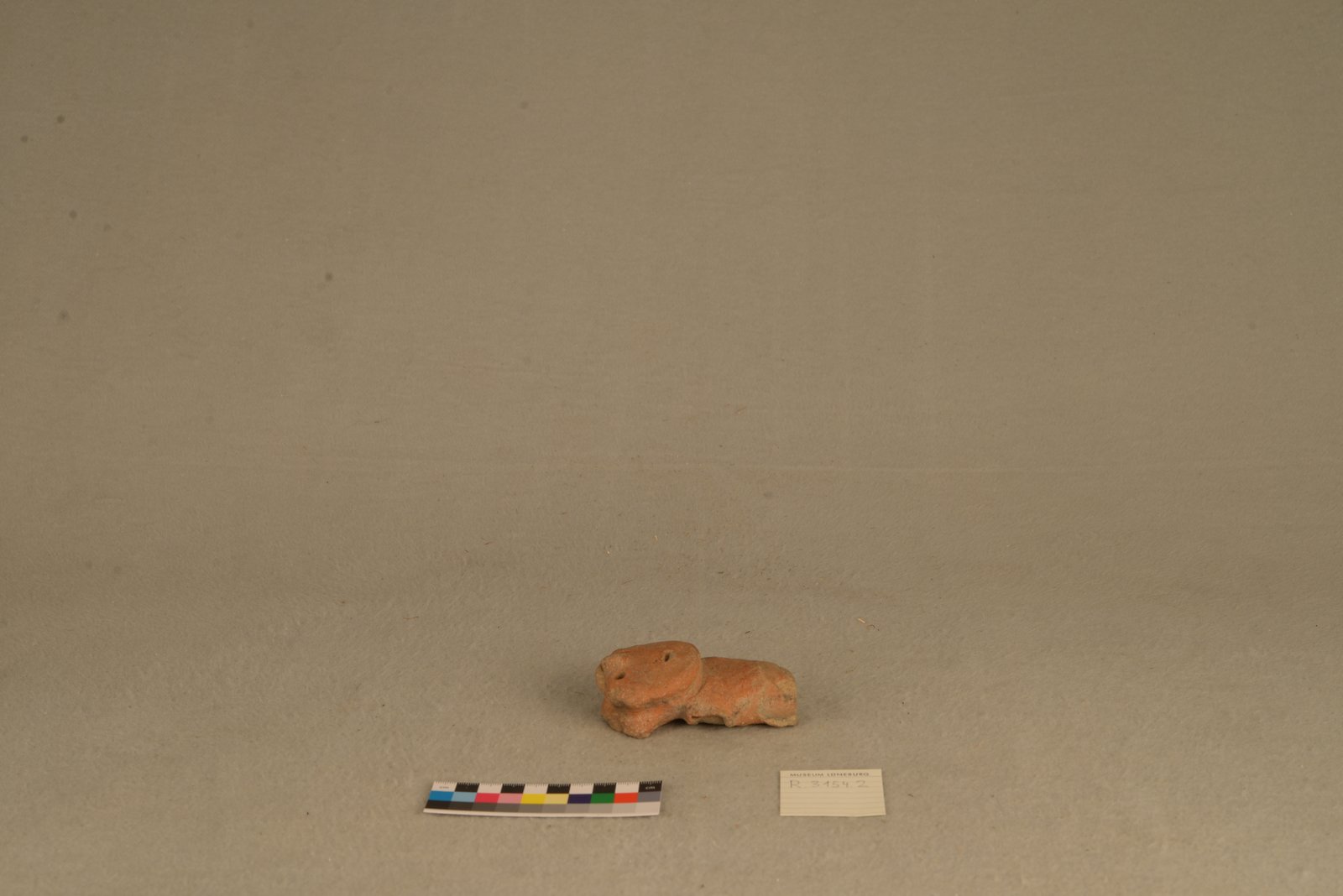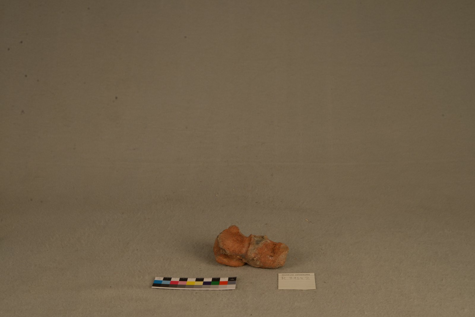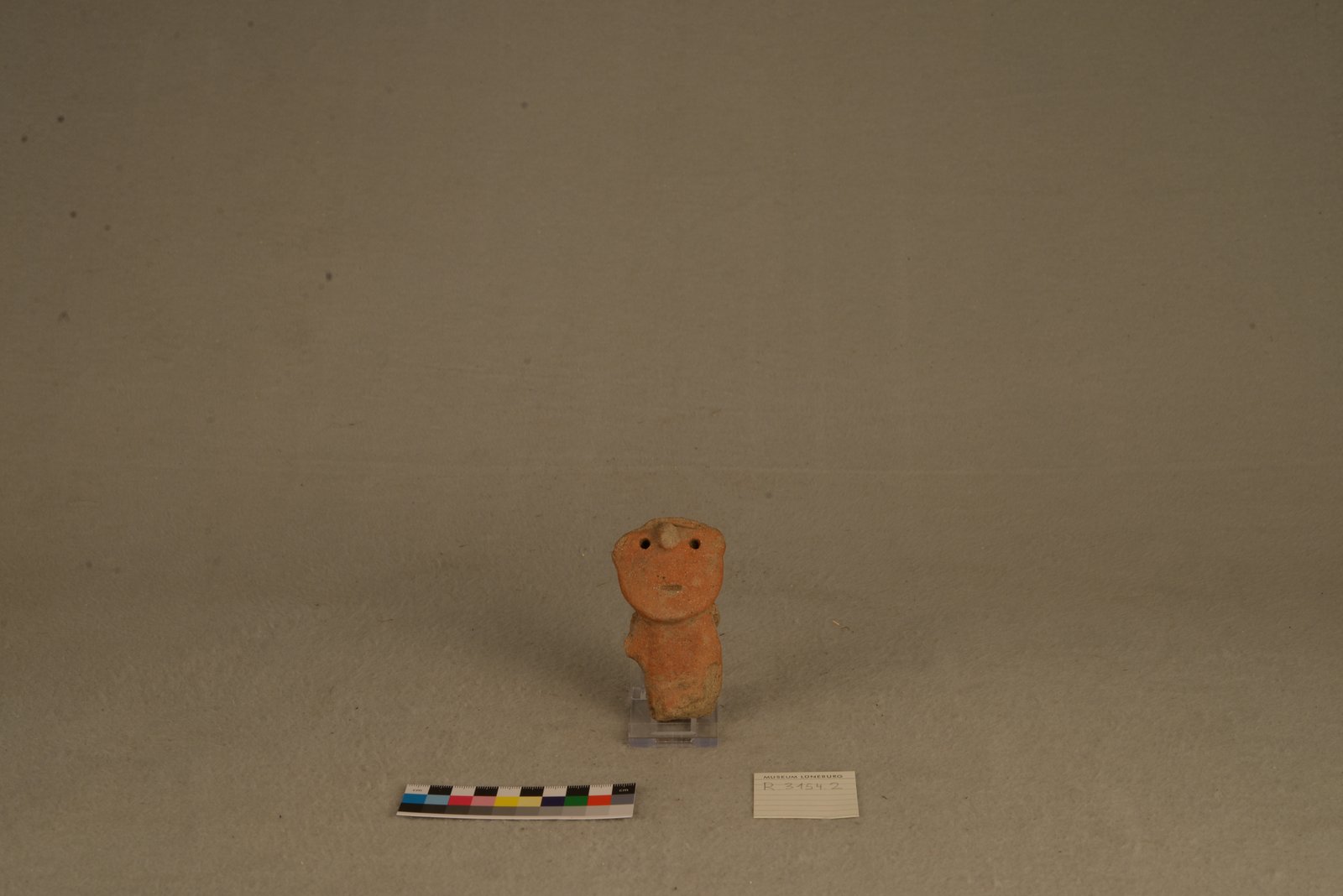 | Description | Kleine rot-braune Tonskulptur mit großem runden Gesicht und kleinem Körper. Augen, Nase, Mund, angedeutete Ohren. Arme und Beine abgebrochen und fehlen. Gräuliche Stellen auf der Rückseite. |