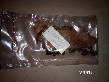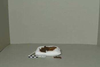 | Description | Es handelt sich um einen Lederflecken, der mit Strängen aus Eisenperlen benäht ist bzw. war. Mindestens einer der Stränge hat sich gelöst, ebenso offenbar manche aufgenähte Perlen. Das Stück ähnelt dem Schmuck V 1416 a.-b. aus zwei mit Eisenperlen benähten Flecken. |