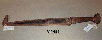 | Description | Kommentar Nzila M. Mubusisi (National Museum of Namibia, Windhuk), September 2019: Die meisten Männer - bei verschiedenen ethnischen Gruppen in Namibia - besaßen früher solche Messer und verwendeten sie in der Küche sowie bei Männeraktivitäten. Es waren keine "Dolche" im engeren Sinn, sie wurden eher als Messer benutzt, allerdings durchaus auch zur Selbstverteidigung. |