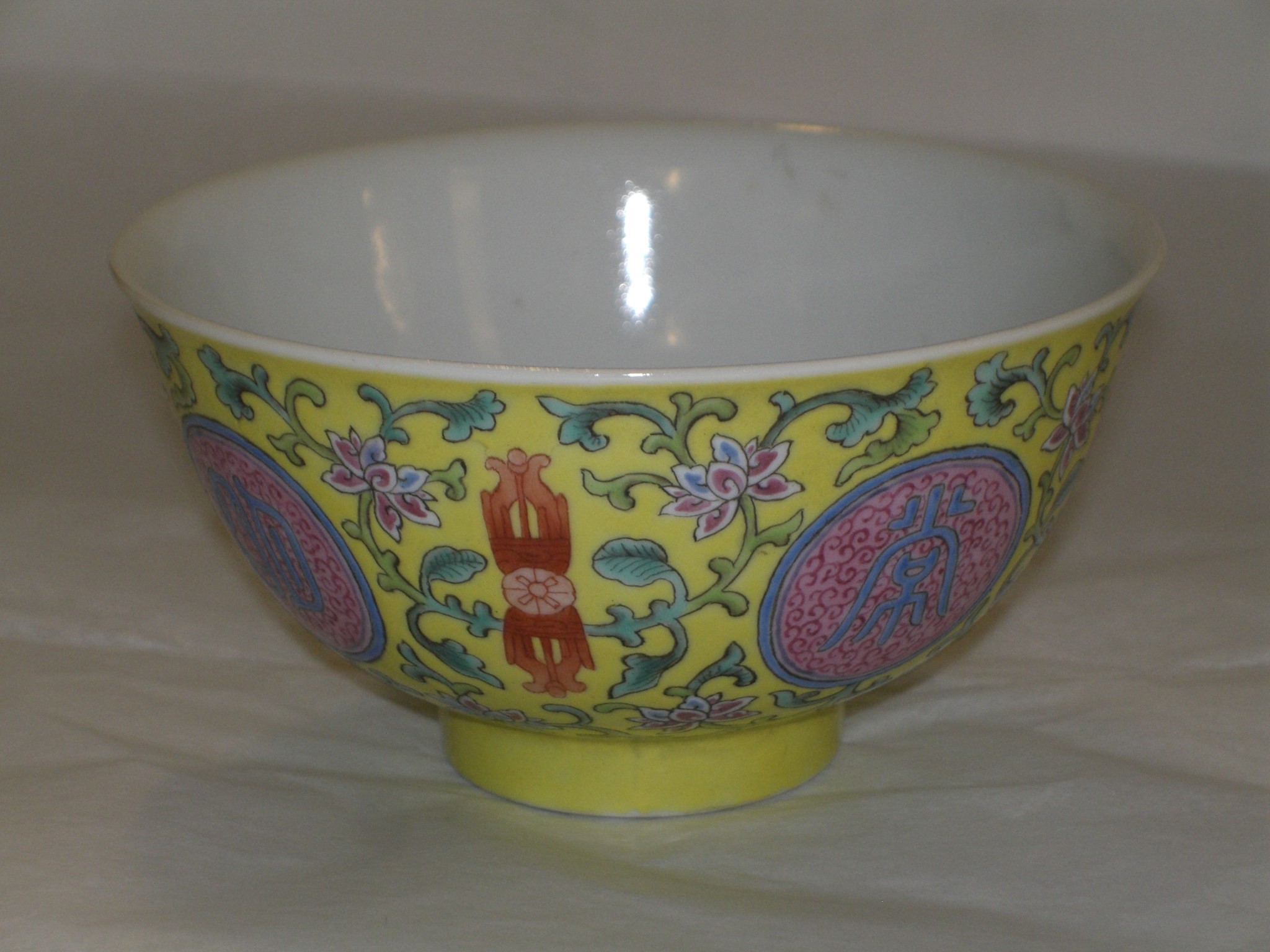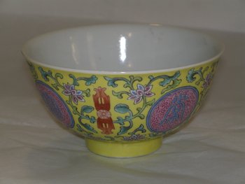 | Description | Auf gelbem Grund in Muffelfarben bemalt. Vier rosafarbenen Medaillons enthalten dunkelbaue, archaistische Schriftzeichen it der Bedeutung: "Beständig im Angesicht Buddhas"; dazwischen sieht grüne und schwarz nachgezeichnete Ranken und Blüten in Rosa und Blau, die sich mit vier eisenroten Blumenarabesken abwechseln. Die rosafarbenen Medaillons sind mit feinen, schwach betonten Schnörkeln geschmückt. Qing-Dynastie (1644-1911), lt. Ohlmer-Katalog 1898: Qianlong-Periode (1736-1795); Das Objekt ist im Katalog durch Ohlmers Sammlung unter der Nr. 65 (1932) und Nr. 86 (1898 Bunt) zu finden. V 11.128 und V 11.129 sind fast identisch, aber nicht zeitgleich entstanden. |