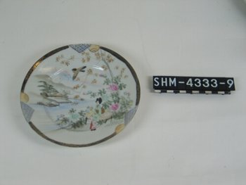 DescriptionHergestellt in Japan oder von japanischer Firma. Teller: Porzellan, China: asiatisches Motiv, 11 Stück: weißer, harter Scherben, auf Engobe in grün, braun, rose`und mit Gold bemalt, Motiv: Innenseite : Chinesinnen auf einer Bank am Fluß von blühenden Sträuchern umgeben, Greifvögel über ihr, Außenseite : Fluß , Häuser und Berge , Rand : auf schwarzem Grund Goldbemalung durch drei Tücher, Lampions unterbrochen, Tülle und Henkel mit Gold verziert