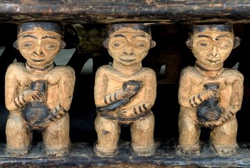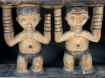 | Description | Zum persönlichen Besitz des Fon/Königs und Inventar des Palasts gehörte dieses Bett. Vor 1909, in der Zeit als Strümpell das Bett in Besitz nahm, regierte Asèh Yufanyi, der selbst Schnitzer war (Harter 1992: 182). Ob der König dieses Bett schnitzte oder einer seiner Handwerker ist heute schwer zu sagen. Mitunter ging die Urheberschaft an den König über, auch wenn er selbst die Arbeit nicht durchführte. (Sein Nachfolger Phonchu Asèh regierte von 1910-1918 und war ebenfals Schnitzer) Beschreibung auf der alten Karteikarte: "Aus einem Stück gearbeitetes hölzernes Bett. Am Kopfende ein vollrund ausgeschnittener Puma, auf der einen Seite als tragende Figuren in der Mitte der Häuptling, rechts und links von ihm zunächst seine Weiber mit Palmwein, dann die Großen des Reiches. Auf der anderen Seite stilisierte Schildkröten (?). (Die Seitenteile sind, um den Transport zu ermöglichen, abgesägt.)" Mit "Schildkröten" war das in der Ikonografie des Kameruner Graslands verbreitete Spinnenmotiv gemeint. Die Kopfstütze wird durch einen Leoparden gebildet, dessen Darstellung den Schnitzern des königlichen Hofes vorbehalten war. Mit dem Trinkhorn wurden Trankopfer für die Ahnen dargebracht und zeichneten als Attribut den Fon oder Notabeln aus. Die beiden Frauen neben dem Notabeln mit Trinkhorn halten Palmweinbehälter (Kalebassen) in den Händen, während weitere vier Diener des Königs die Liegefläche stützen. Chr. Geary 1983, S. 157 f. Nr. 16, Abb. 39 zeigt ein Vergleichsobjekt. |